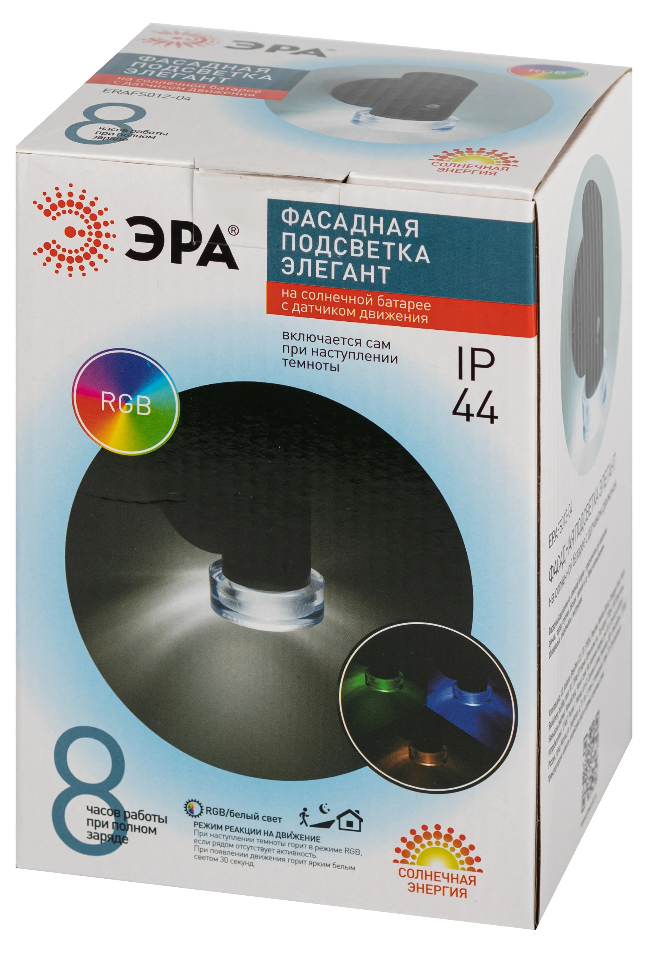 ЭРА ERAFS012-04 «Элегант» (арт. Б0057595) - уникальная новинка на рынке фасадных беспроводных светильников! RGB-светодиоды светят разными цветами, включая нейтральный белый для практичного базового освещения. Отличное решение для эффектного оформления фасада здания. При наступлении темноты автоматически включается мультиколор-подсветка, меняющая цвета. При появлении движения вблизи светильника включается яркое белое освещение. При отсутствии активности в течение 30 секунд датчик движения снова переключает фасадную подсветку на режим RGB. Встроенная солнечная батарея делает данный светильник экологичным и экономичным.