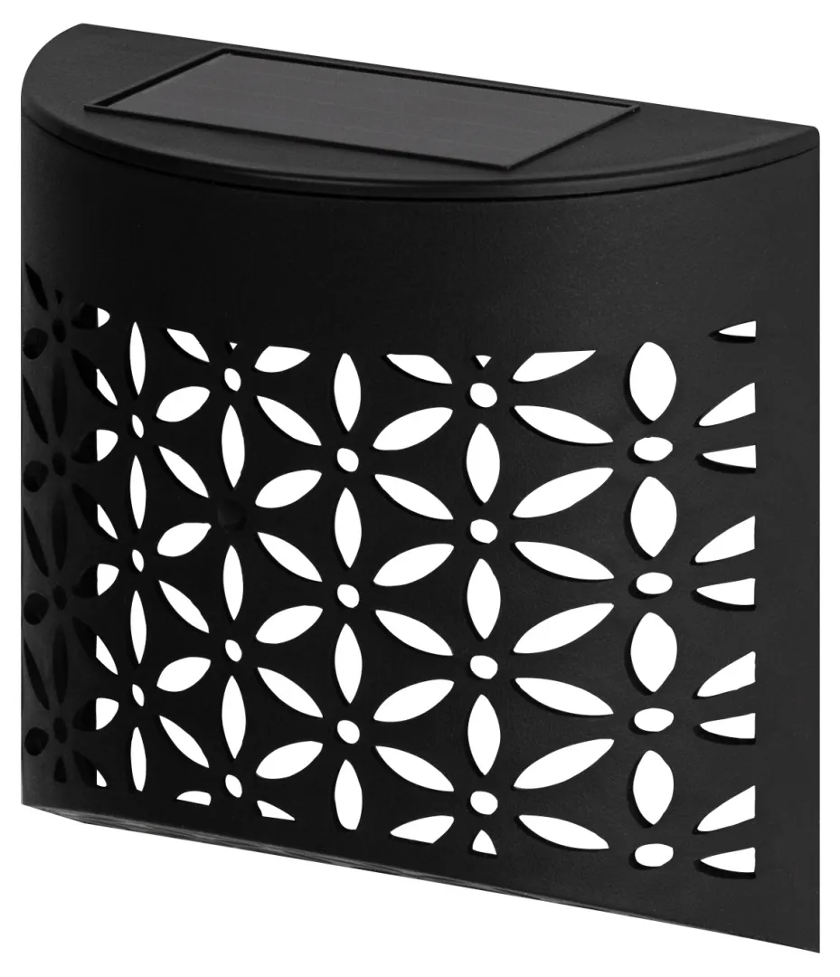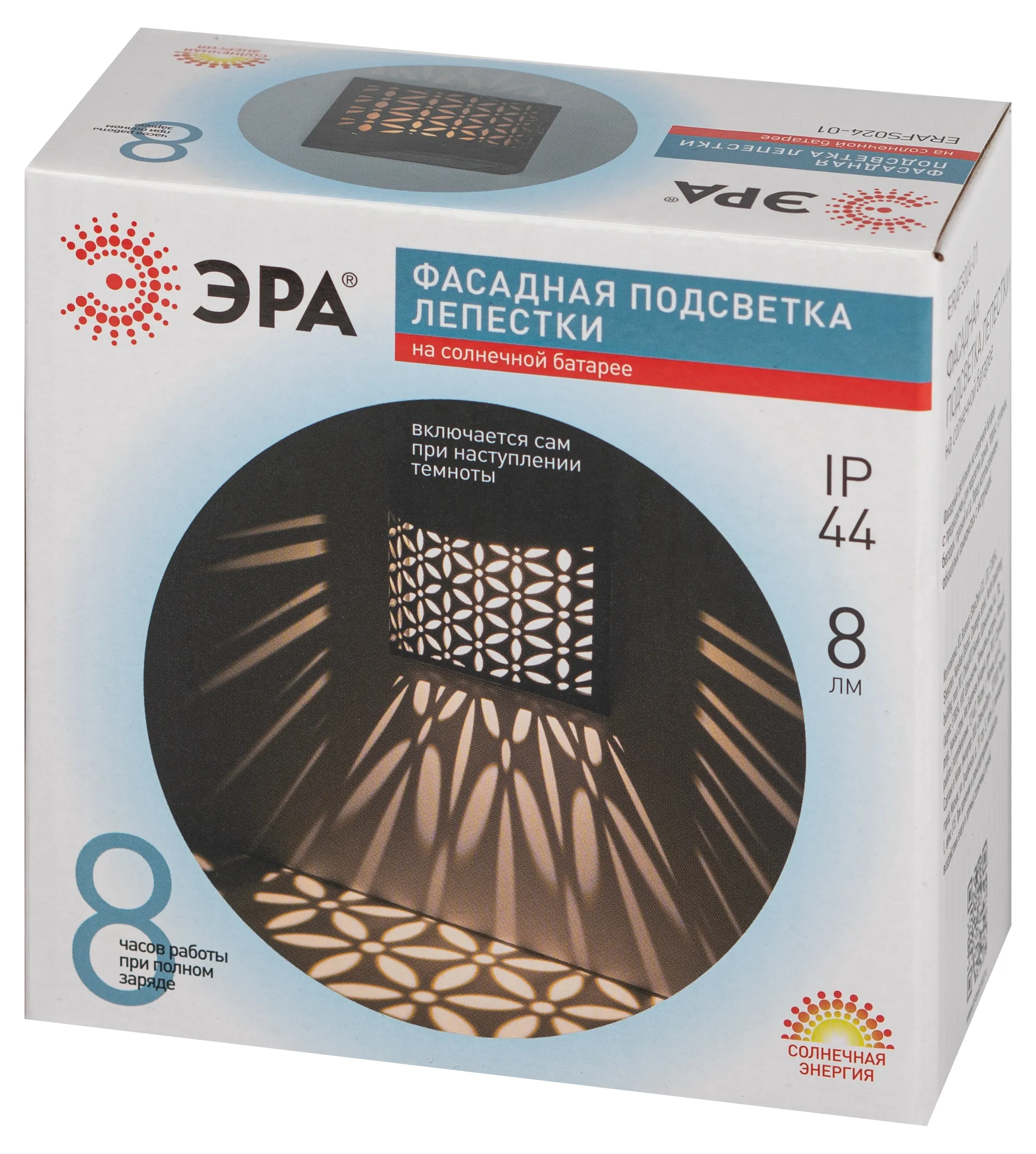 Настенный светильник ЭРА ERAFS024-01 "Лепестки" на солнечной батарее с перфорированным орнаментом в виде цветочных лепестков. Беспроводная подсветка проецирует на фасад красивый световой рисунок. LED-светильник заряжается в течение светового дня и автоматически включается с наступлением темноты. Габариты: 1 1х 11 х 5 см.