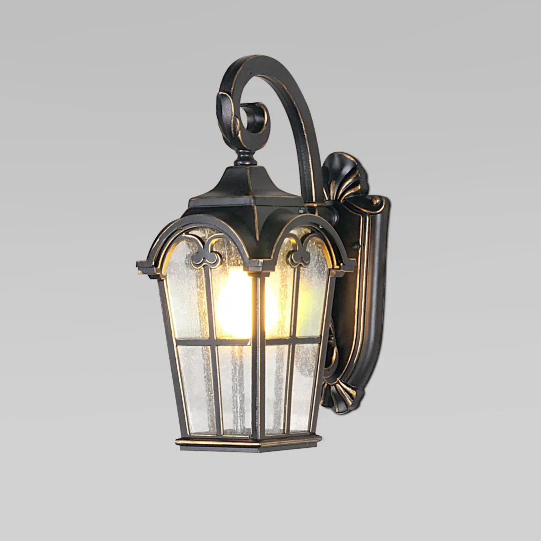 Уличный настенный светильник Mira D черное золото IP33 предназначен для создания дополнительного освещения, а также декоративной подсветки снаружи и внутри помещений. Благодаря стеклянному плафону создает мягкое равномерное свечение. В качестве источника света используются сменные лампы с цоколем E27. Патрон рассчитан на максимальную мощность ламп накаливания 60 Вт.