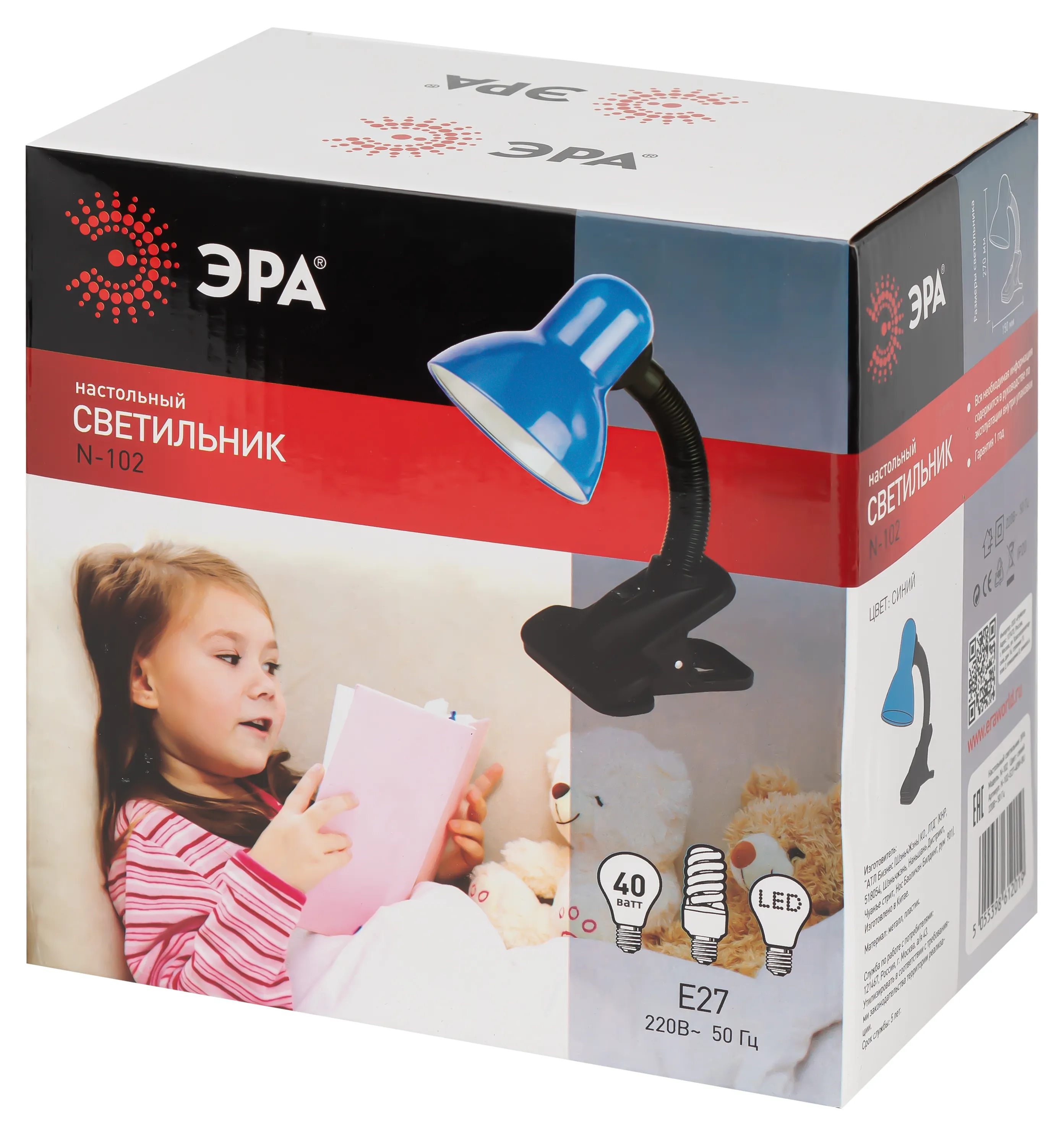 Настольный светильник-прищепка ЭРА N-102-E27-40W-BU может использоваться с лампой накаливания, компактной люминесцентной лампой (КЛЛ) или светодиодной (LED) лампой. У светильника прочная удобная прищепка и металлический плафон. Наклон и поворот плафона в любом направлении для удобного направления света. Поставляется в индивидуальной картонной коробке.