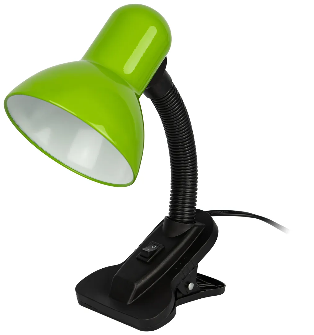 Настольный светильник с металлическим плафоном. Направление света регулируется гибкой стойкой, которая обеспечивает наклон и поворот плафона в любом направлении. Выключатель на прищепке. Классический дизайн. Предназначен для использования с лампой накаливания или компактной люминесцентной лампой (КЛЛ).