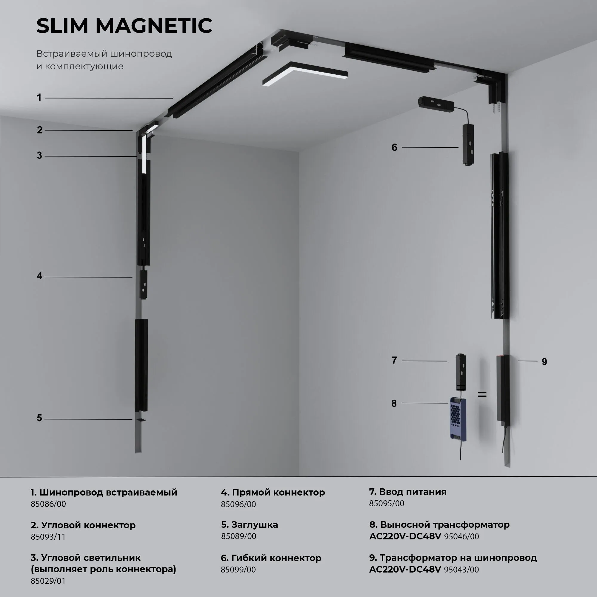 Корпус коннектора изготовлен из металла. Для соединения с шинопроводами в комплект входят соединительные планки. Для обеспечения электрического соединения шинопроводов необходимо использовать Slim Magnetic Гибкий коннектор 85099/00 или светильник с функцией передачи питания арт. 85029/01 (приобретается отдельно).