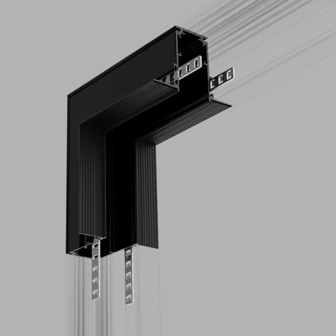 Коннектор угловой черный для встаиваемого шинопровода Slim Magnetic. Служит для соединения встраиваемых шинопроводов в двух плоскостях под прямым углом 90°.