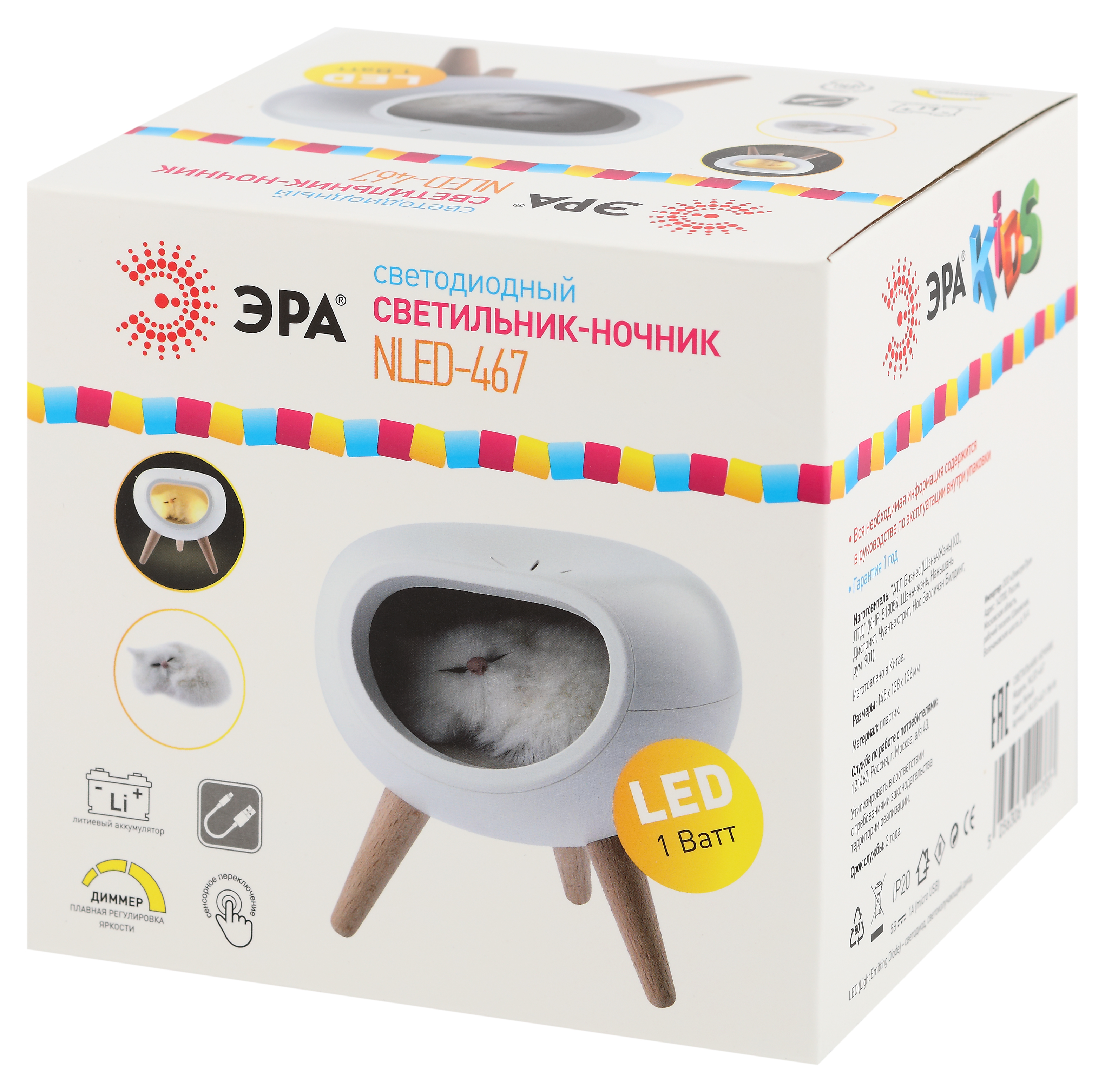 Автономный светильник-ночник ЭРА NLED-467-1W-W со светодиодами (LED). Ночник выполнен в виде стильного корпуса-домика на деревянных ножках, в котором "живет" пушистый котик. Домик светится изнутри. Пушистого котика можно вытащить! Внутри светильника котик крепится на магнит, будет держаться на любой другой металлической поверхности. Встроенный литиевый аккумулятор для автономной работы. Подзарядка от USB. USB-кабель в комплекте. Плавная регулировка яркости (прикосновением и удерживанием сенсорной кнопки на фронтальной части). Выключатель на корпусе. Светодиодный светильник-ночник ЭРА создаст для вас уютную подсветку и хорошее настроение!