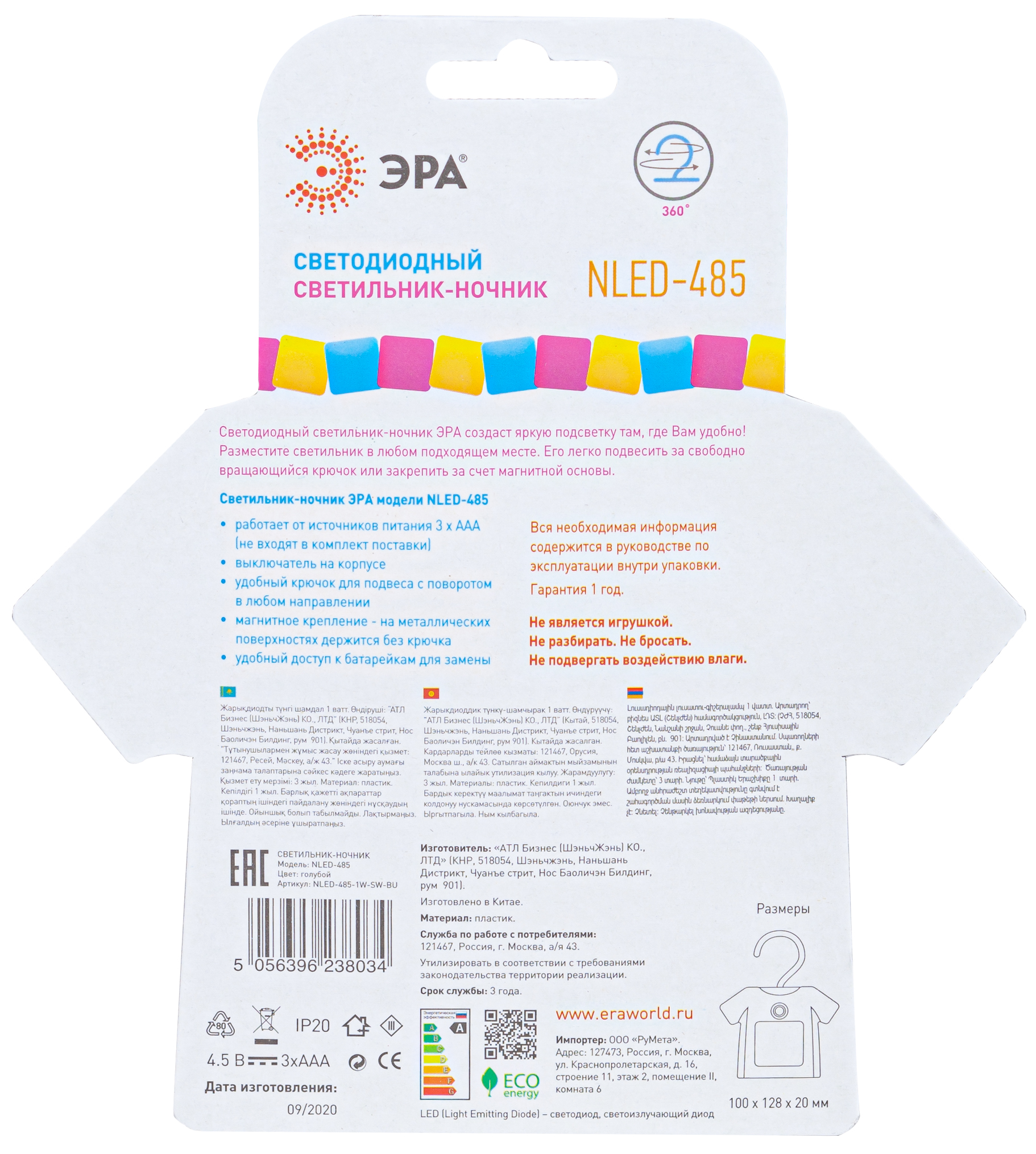 Удобный, красивый и функциональный светильник-ночник ЭРА NLED-485-1W-SW-BU со светодиодами (LED), с выключателем. Дизайн корпуса светодиодного ночника напоминает рубашку на вешалке. Светильник автономный, работает от элементов питания 3 х ААА (не входят в комплект поставки), у него есть крючок для подвеса с поворотом в любом направлении. Есть магнитное крепление - на металлических поверхностях держится без крюка. Также светильник-ночник можно просто поставить - будет устойчиво стоять. Используйте его где удобно - можно повесить в шкаф для подсветки, в любое другое подходящее место, просто поставить и даже прикрепить на холодильник. Поменять батарейки очень легко. Поставляется в блистерной упаковке с евроотверстием.