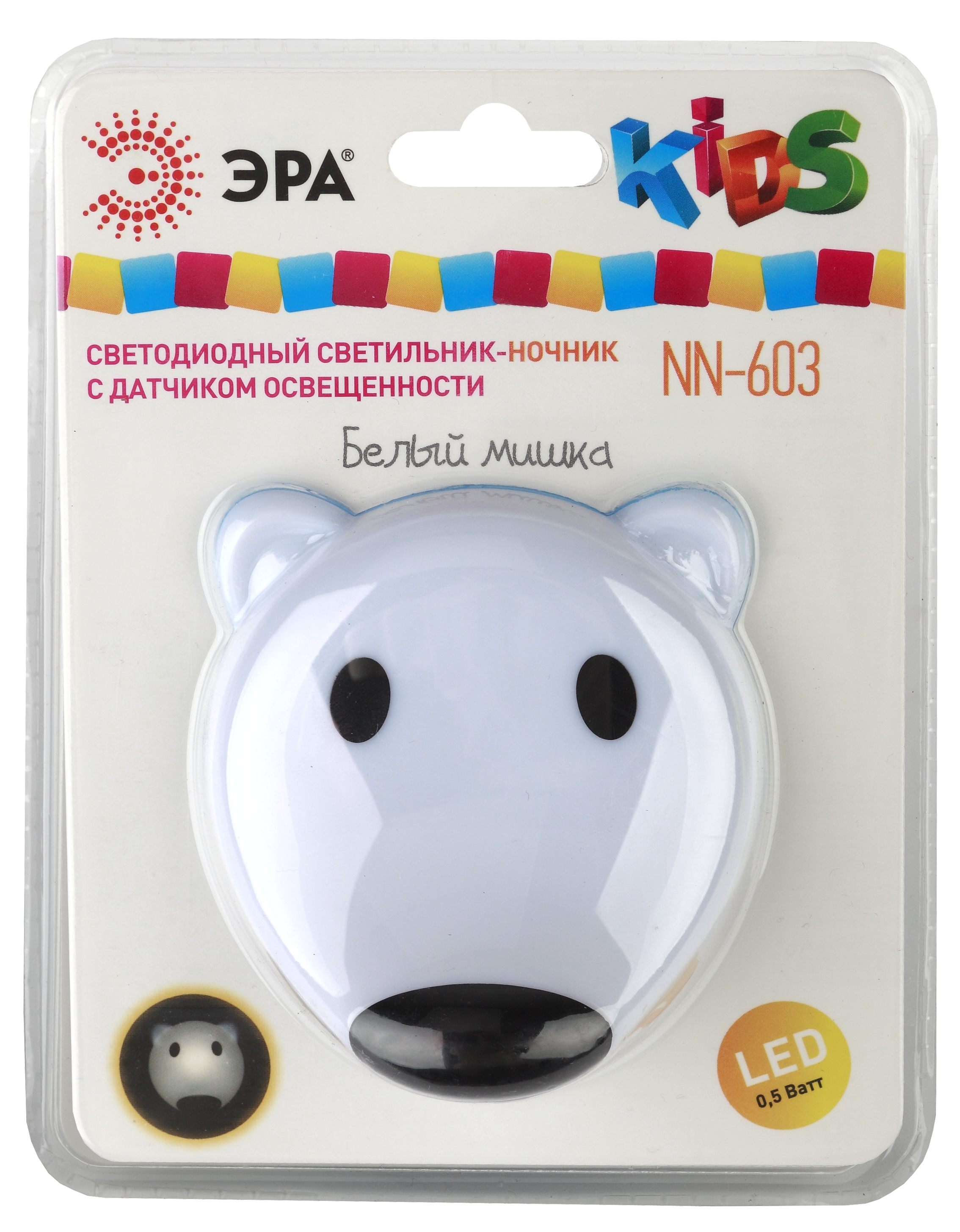 Ночник NN-603-LS-W "Белый мишка" со светодиодами (LED) в качестве источников света и встроенным датчиком освещенности. Включается автоматически, если вокруг темно, и так же сам гаснет с рассветом. Среди множества вариантов ночников миниатюрные модели, вставляющиеся в розетку - одни из самых удобных. Светодиодные ночники ЭРА успешно выполняют свою основную функцию - создают мягкий рассеянный свет. Они отличаются мизерным энергопотреблением, которое будет незаметно в общем счете за электроэнергию. При необходимости можно смело оставлять их включенными ночи напролет. Современная LED технология исключает пульсации света, освещение ровное и приглушенное - то, что нужно для комфортного сна или ночной подсветки. Упаковка позволяет проверить работу ночника, не доставая его из блистера, нужно только включить его в розетку и прикрыть датчик освещенности рукой.