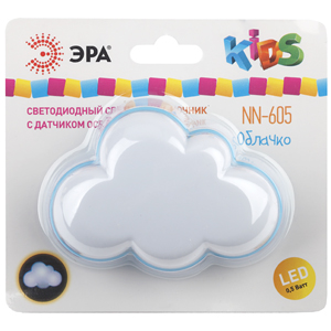Ночник ЭРА в виде облачка - идеальный подарок для ребенка. Детский светодиодный ночник светильник в розетку с датчиком освещенности ЭРА представлен в 7-ми вариациях: модель NN-605-LS-W – Облачко; модель NN-626-LS-Y – Бычок, модель NN-601-LS-R - Божья коровка; модель NN-607-LS-BU – Воздушный шар; модель NN-603-LS-W – Белый мишка; модель NN-606-LS-W – Клевер; модель NN-631-LS-P – Хрюшка.