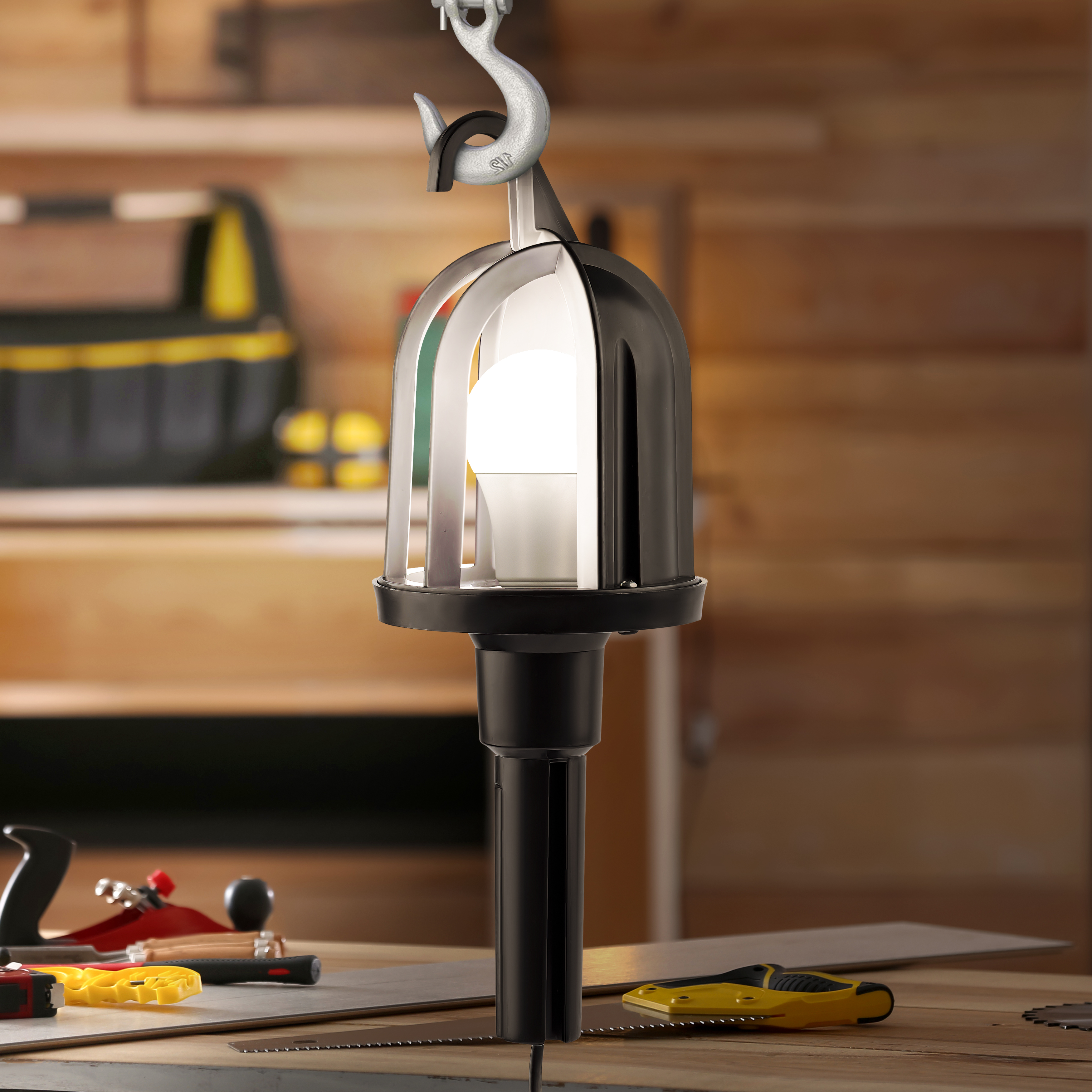 Светильник переносной под лампу с цоколем E27 (рабочая лампа). Предназначен для внутреннего освещения жилых и общественных помещений. Рассчитан для работы в сети переменного тока с номинальным напряжением 250 В и частотой 50 Гц. Максимальная мощность для лампы накаливания 60 Вт. Специальный подвесной крюк позволяет надежно закрепить светильник в момент эксплуатации, что делает его удобным для применения в гаражах или других подсобных помещениях.