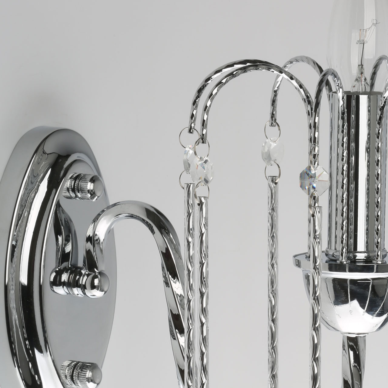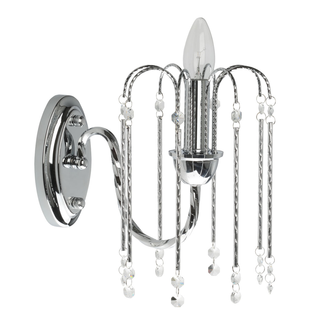 Металлическое основание бра гальванизировано в цвет хрома. Витой рожок выполнен по технологии твист. Вертикальное бра декорировано прозрачным хрусталем высокого качества и витыми элементами из сплава алюминия с лазерной насечкой.