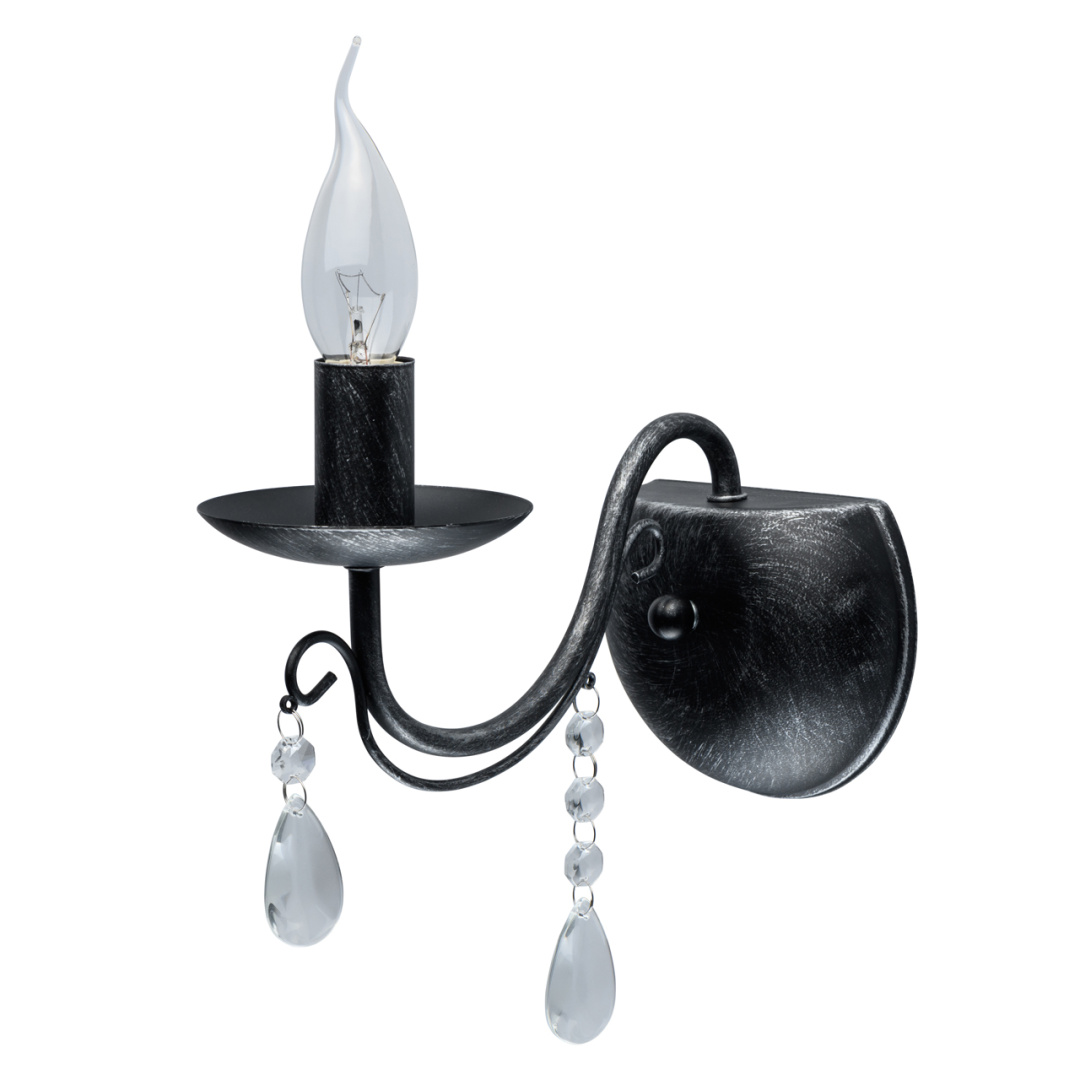 Основание светильника выполнено из металла и обработано по технологии хай-лайт, где основной слой черного цвета, а декоративный слой серебряного цвета. Светильник декорирован прозрачным хрусталем.