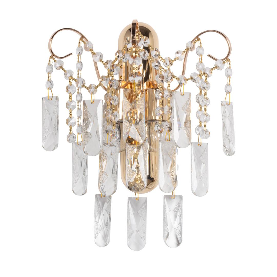 Металлическое основание светильника гальванизировано в цвет золота. Настенное бра декорировано прозрачным хрусталем.