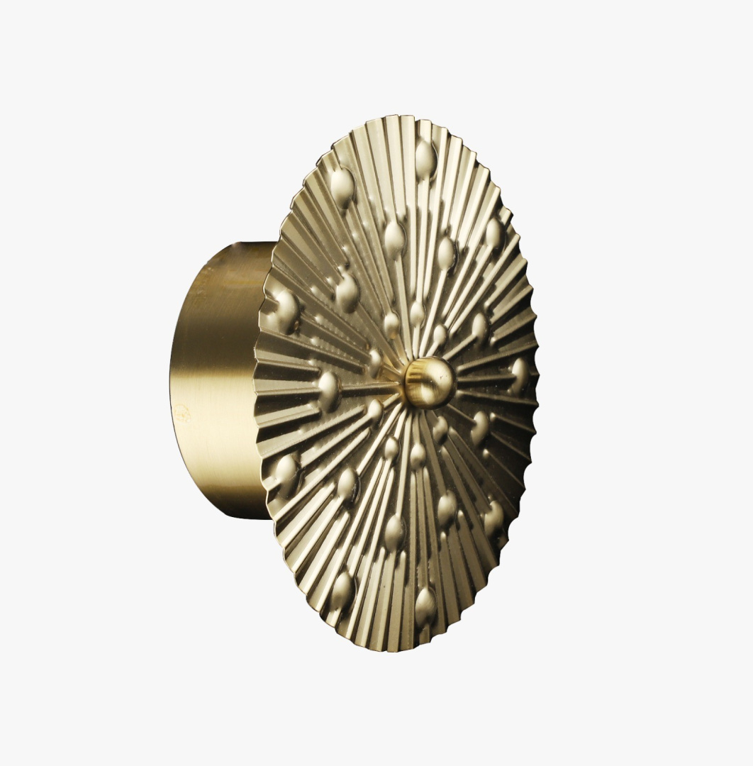 Металлическое основание настенного бра гальванизировано в цвет латуни. Плафон выполнен из сплава алюминия с цинком и гальванизирован в цвет основания. Настенное бра декорировано плафоном из металла с рельефной текстурой.