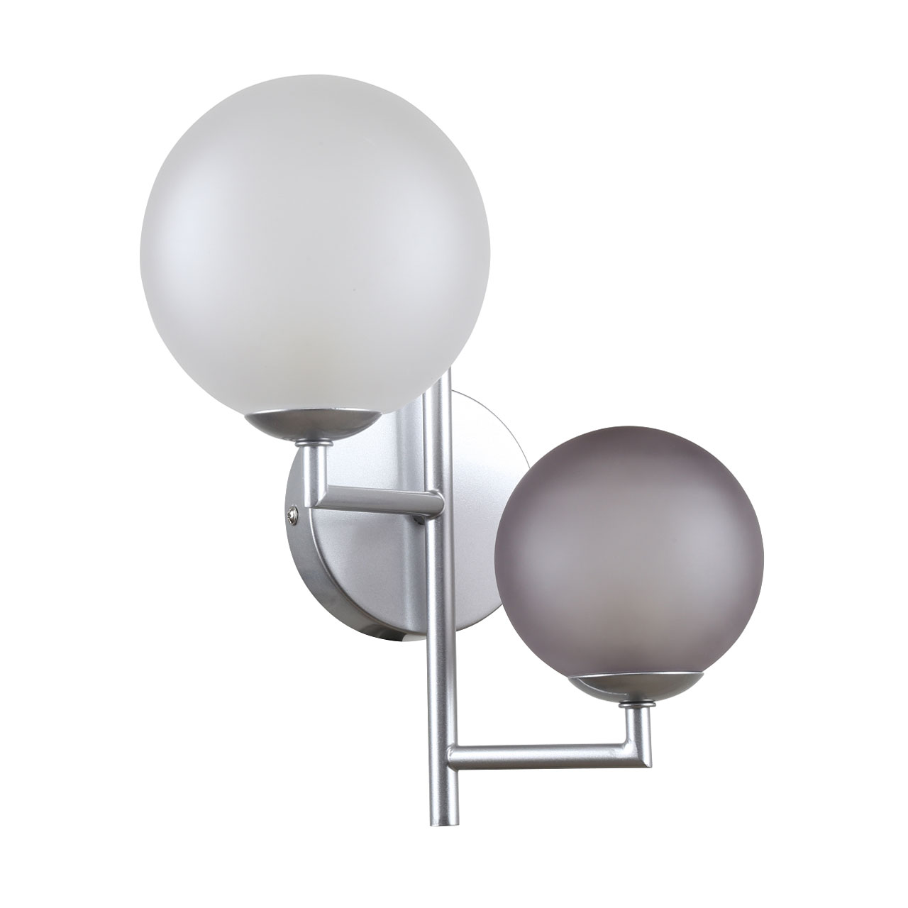 Металлическое основание настенного бра окрашено в цвет перламутрового серебра. Источники света закрыты стеклянными плафонами белого и дымчатого цвета.