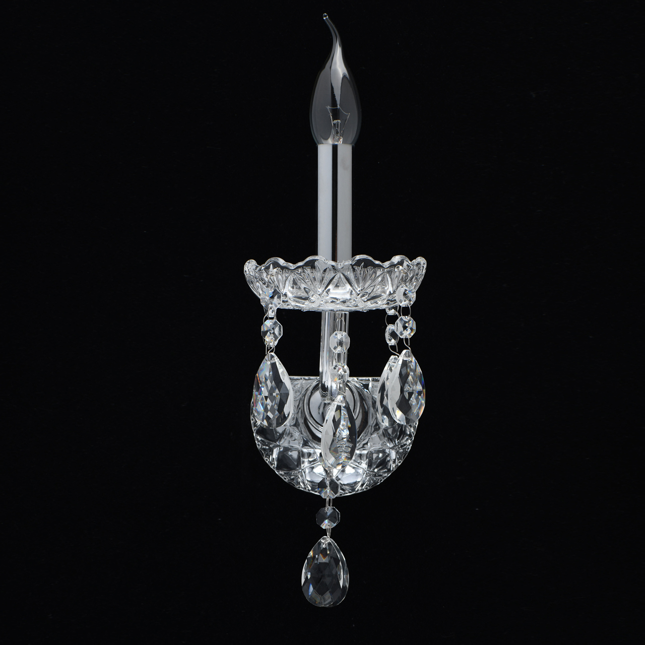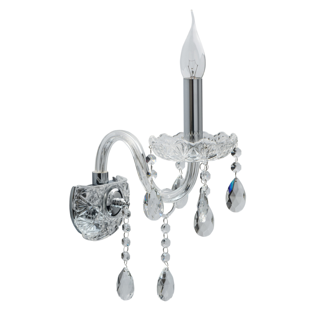 Основание бра выполнено из металла и гальванизировано в цвет хрома. Рожок выполнен из стекла гутным способом. Основание декорировано прозрачным стеклом, отлитым в сложную форму. Светильник декорирован прозрачным хрусталем формы октагон и миндаль.