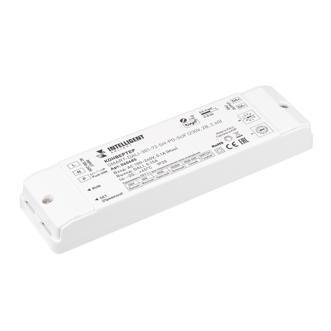 Конвертер Zigbee (TUYA) сигнала и RF сигнала серии SMART в DALI для DIM/MIX/RGB/RGBW/RGB-MIX источников света. Управляется при помощи Яндекс.Алисы. Питание AC230V, выходной сигнал DALI. Возможность внешнего управления Push-Dim. Корпус - PVC. Габариты 140х38х20.5 мм. Совместим с пультами и панелями SMART.