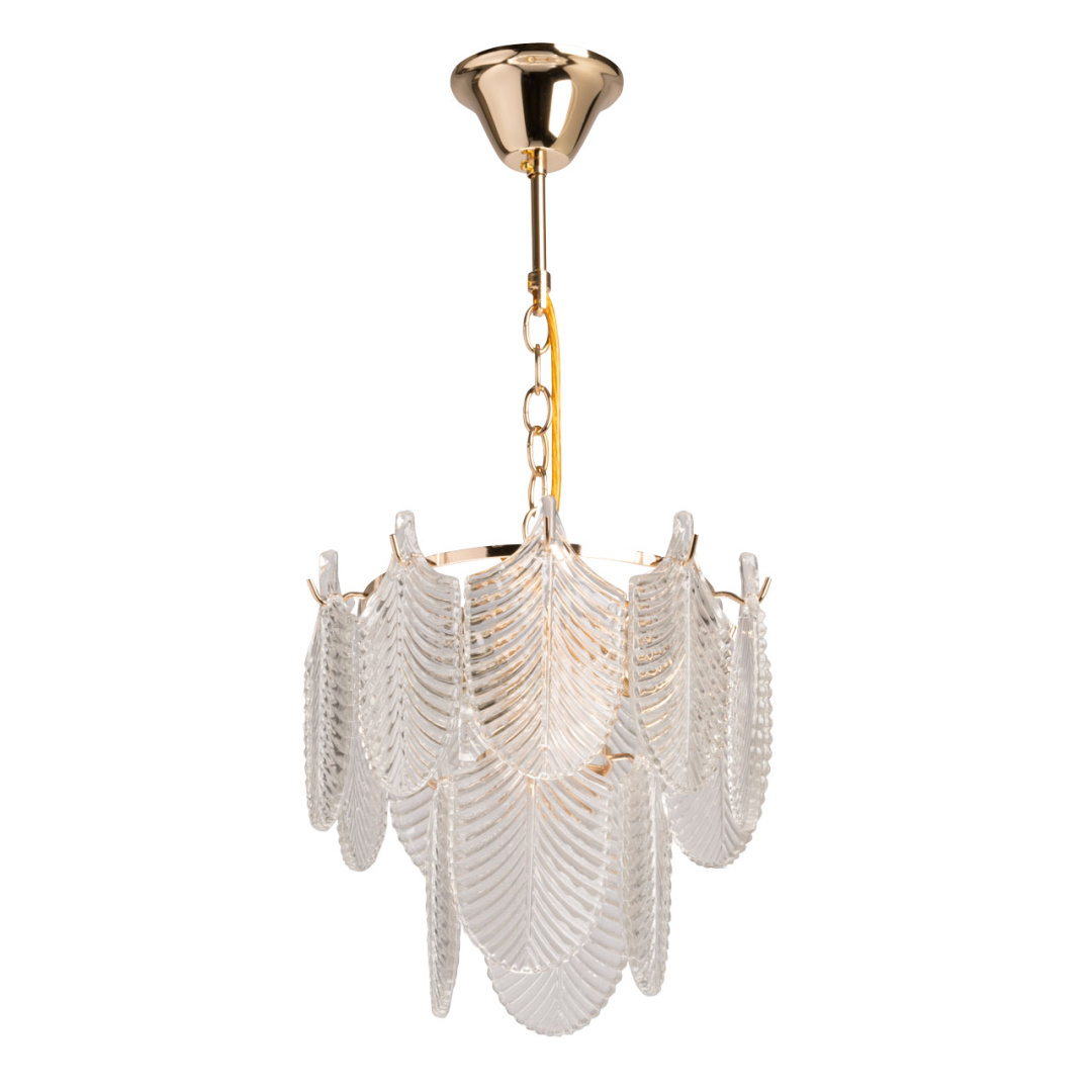 Металлическое основание подвесной люстры гальванизировано в цвет золота. Светильник декорирован прозрачными стеклянными пластинами в форме листьев.