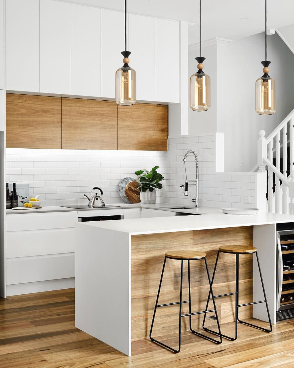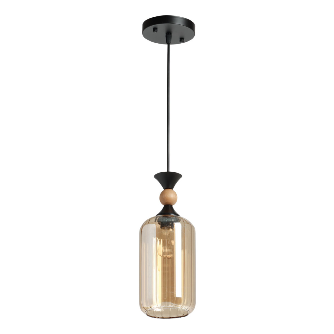 Металлическое основание подвеса окрашено в черный цвет. Стеклянный плафон гальванизирован в цвет коньяк. Декоративный элемент на подвесе выполнен из натурального светлого дерева.