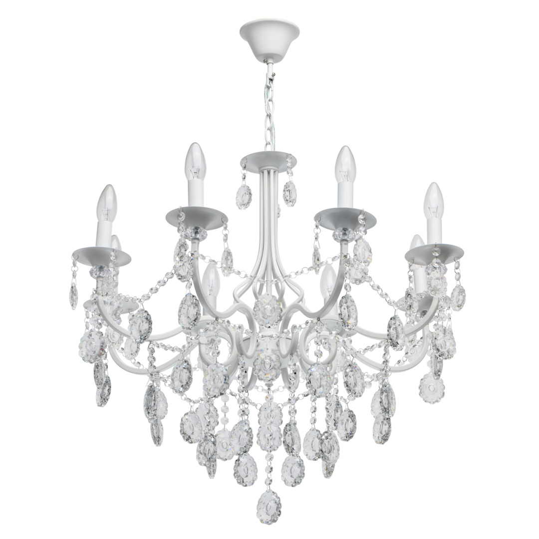 Основание светильника выполнено из металла и окрашено в белый цвет. Светильник декорирован прозрачным хрусталем оригинальной формы.