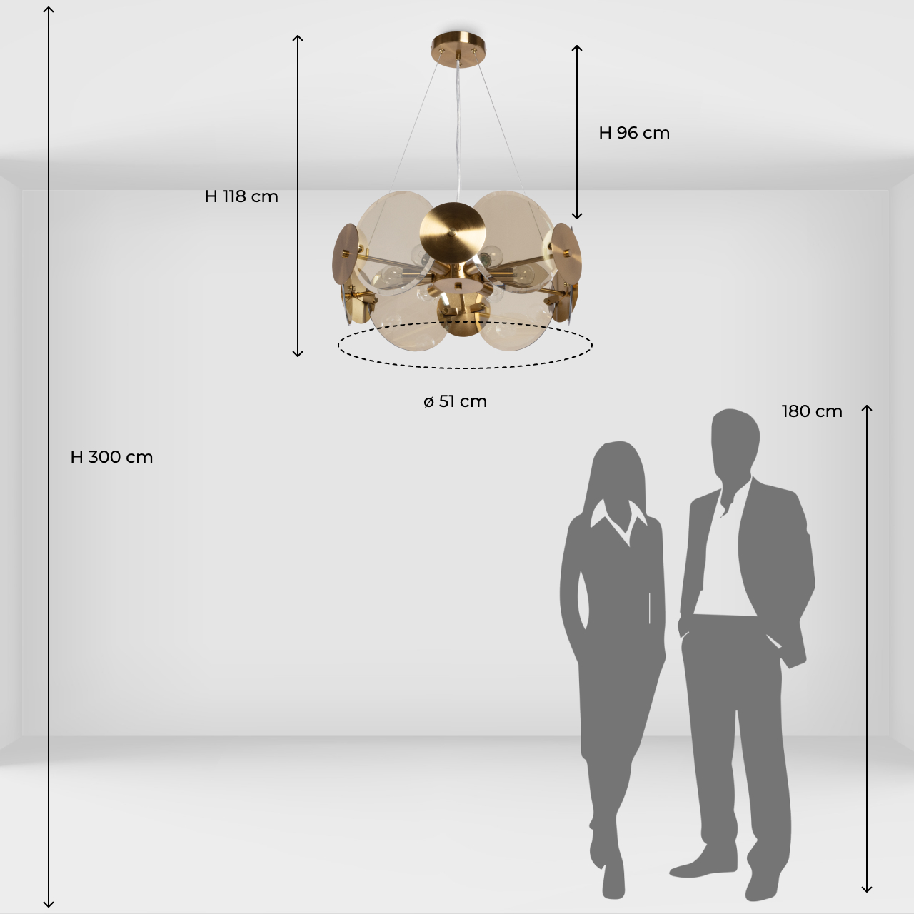 Металлическое основание подвесной люстры гальванизировано в цвет латуни. Светильник декорирован стеклянными элементами в форме круга, гальванизированными в цвет шампань и металлическими кругами, гальванизированными в цвет основания.