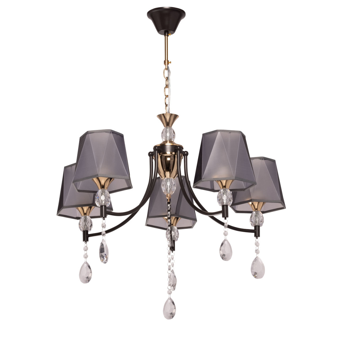 Металлическое основание подвесной люстры окрашено в цвет кофе. Отдельные элементы основания гальванизированы в цвет золота. Источники света закрыты двухслойными текстильными абажурами серого цвета, отделанными кантами. С внутренней стороны текстиль абажуров защищен прозрачным термостойким акрилом. Абажуры прошиты. Люстра декорирована прозрачным хрусталем.