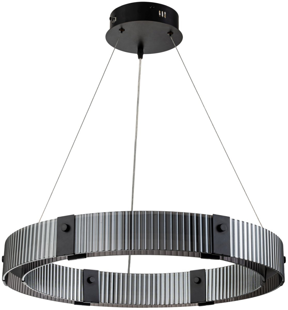 Люстра подвесная коллекции Lucen выполнена из металла, окрашенного в черный цвет, и рифленый плафон из стекла закругленной формы дымчатого цвета. Люстра комплектуется пультом дистанционного управления 2,4G и драйвером высокого качества с европейским стандартом T?V. Пульт дистанционного управления обеспечивает переключение трех режимов световой температуры и диммирование.
