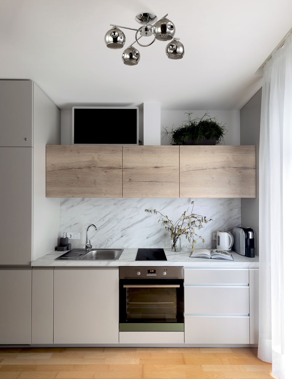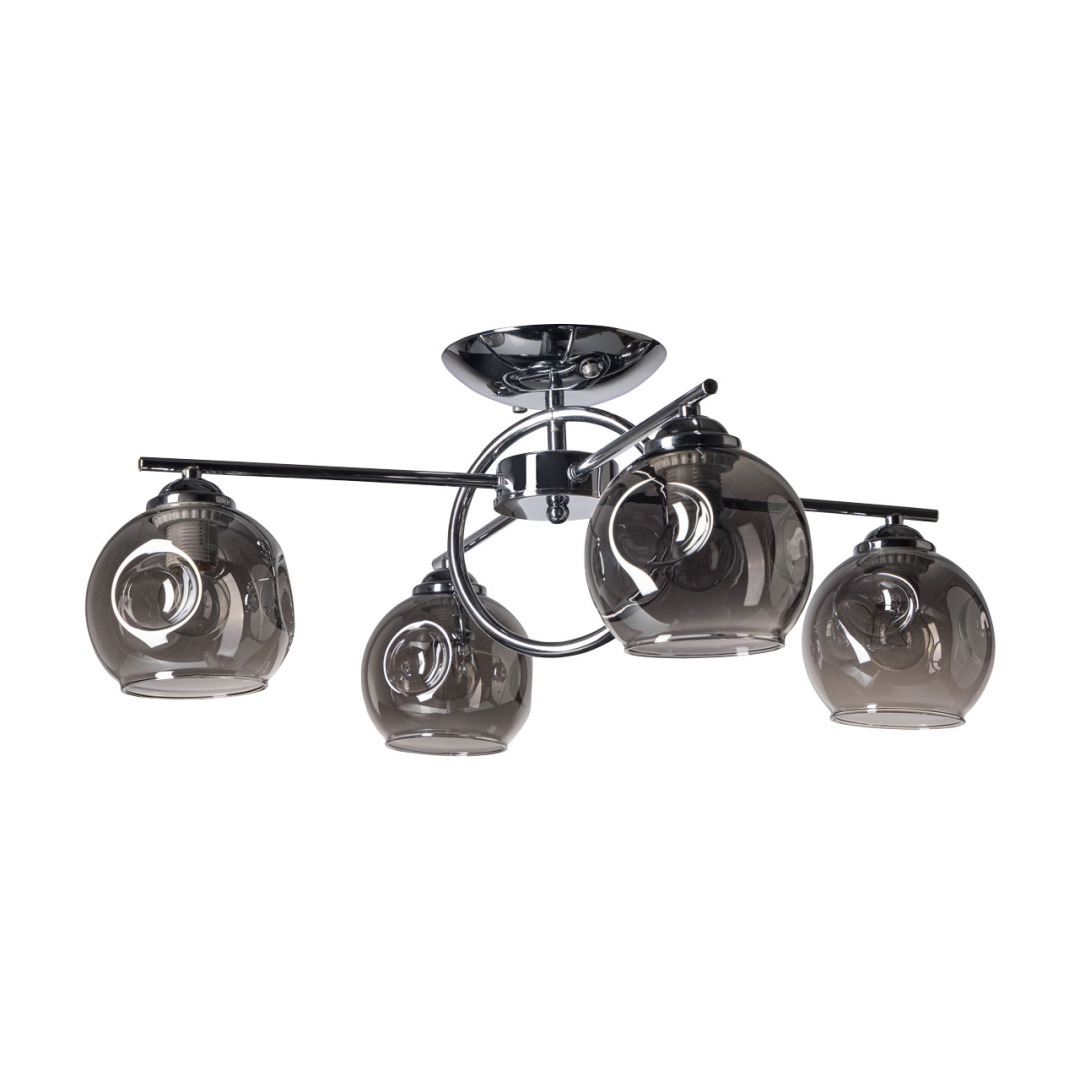 Металлическое основание светильника гальванизировано в цвет хрома. Потолочная люстра декорирована выдувными вручную стеклянными плафонами. Плафоны гальванизированы в дымчатый металлизированный цвет.