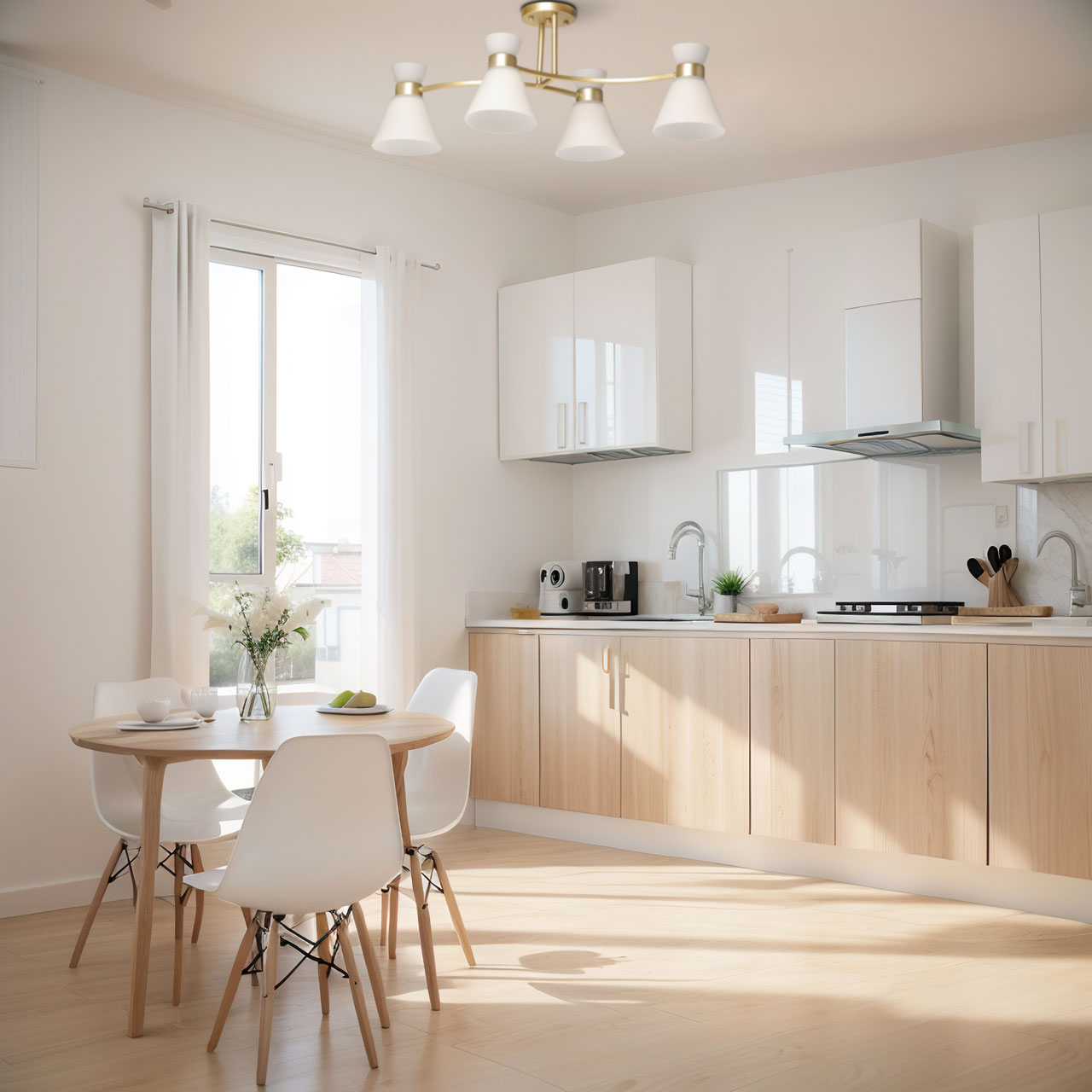 Металлическое основание потолочной люстры окрашено в цвет матового перламутрового золота. Стеклянные плафоны отлиты в форму и матированы.