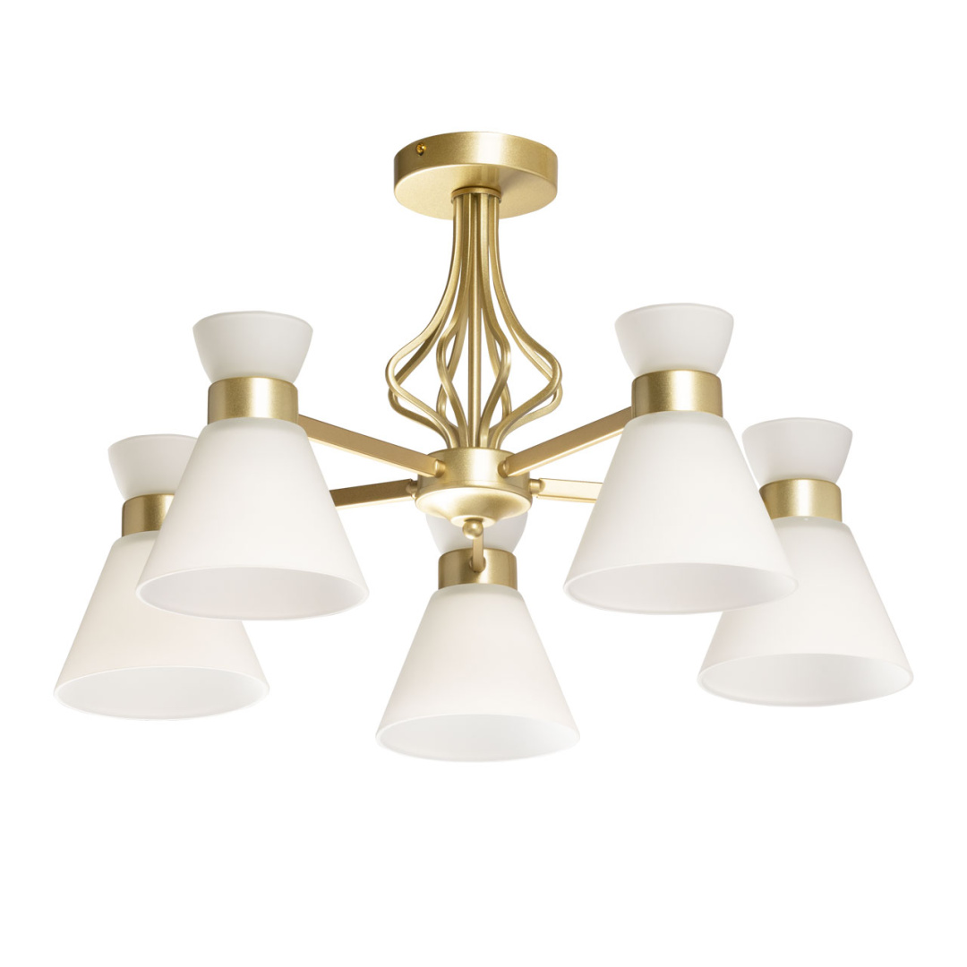 Металлическое основание потолочной люстры окрашено в цвет матового перламутрового золота. Стеклянные плафоны отлиты в форму и матированы.