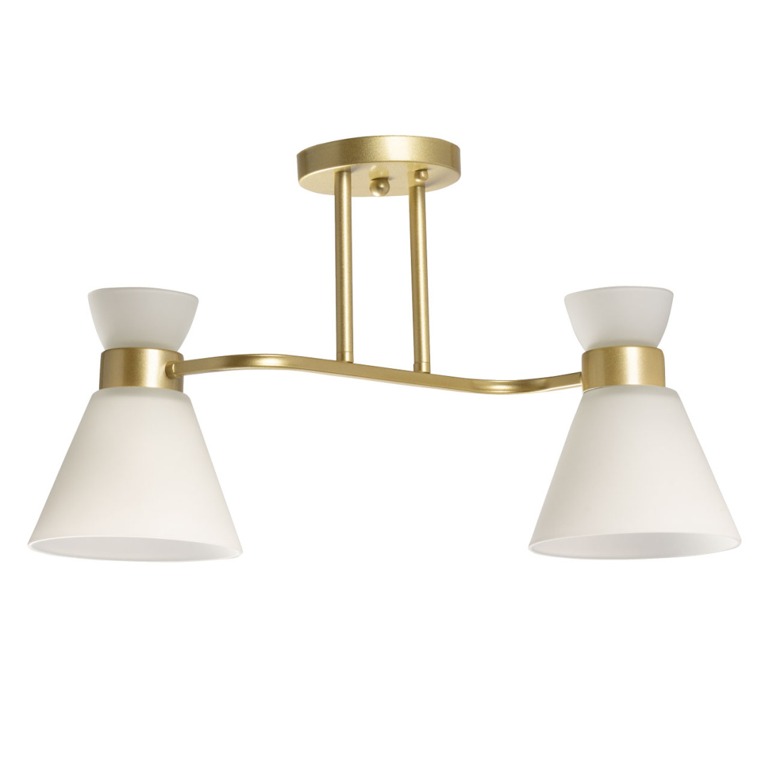 Металлическое основание потолочной люстры окрашено в цвет матового перламутрового золота. Стеклянные плафоны отлиты в форму и матированы.