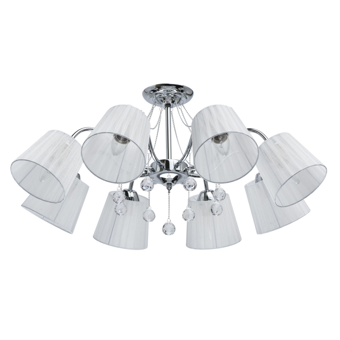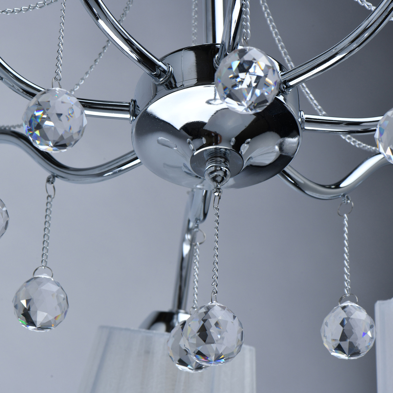 Основание светильника выполнено из сплава  металла и гальванизировано в цвет хрома. Абажуры из прозрачной органзы белого цвета с термостойким акрилом внутри. Абажуры отделаны кантом сверху и снизу, прошиты. Светильник декорирован металлическими цепочками в цвет основания и прозрачным хрусталем в форме шара.