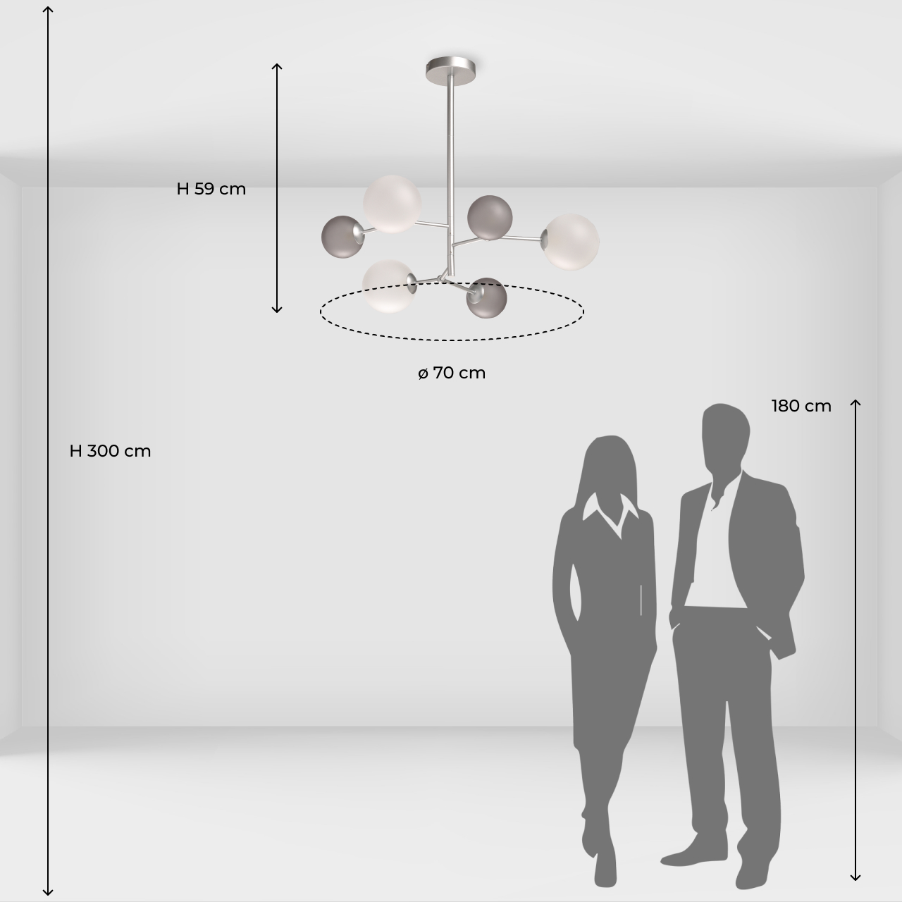 Металлическое основание люстры окрашено в цвет перламутрового серебра. Источники света закрыты стеклянными плафонами белого и дымчатого цвета.