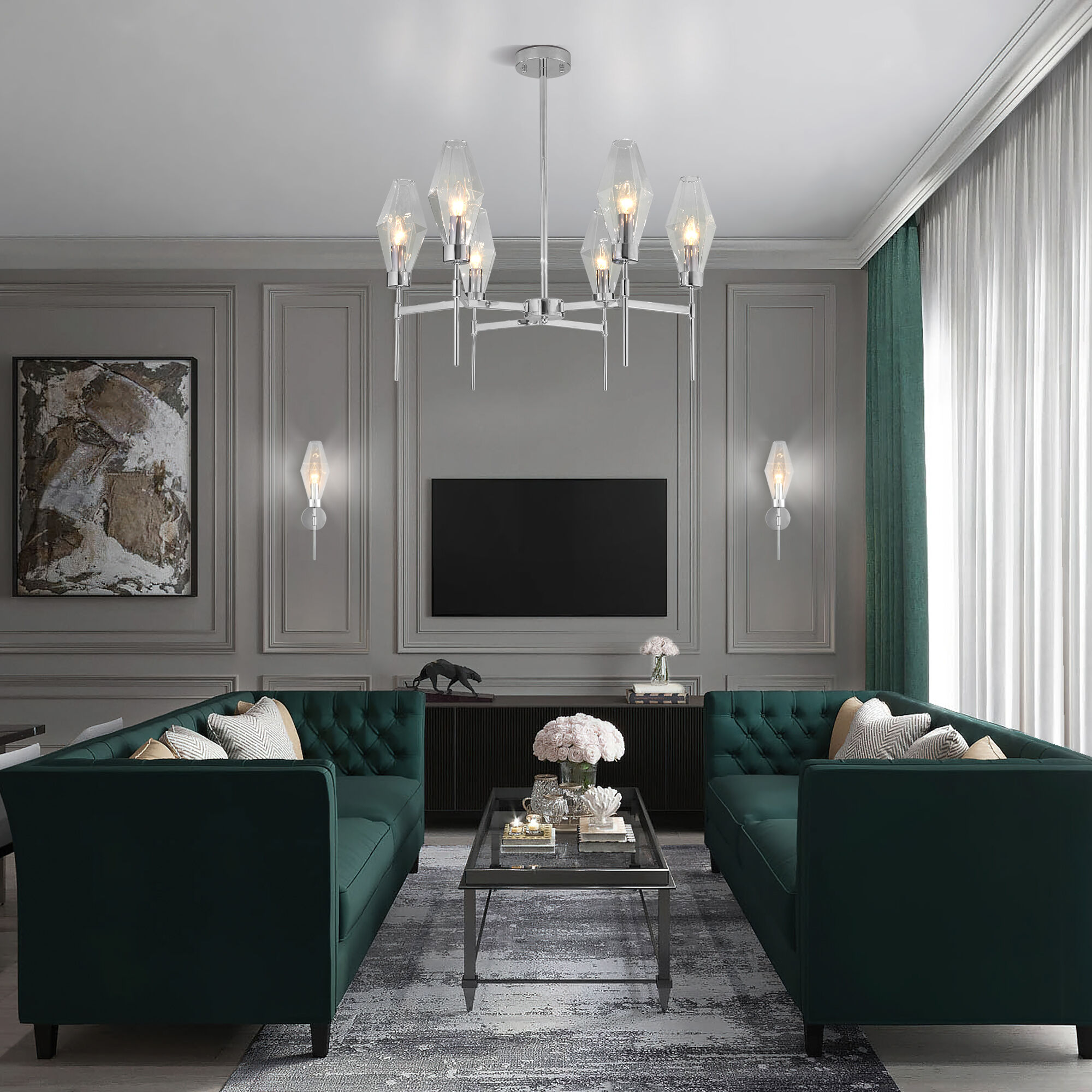 Оригинальное бра Prism объединяет в себе невероятную воздушность и строгую геометрию форм. Невесомый прозрачный плафон ручной работы идеально дополнен тонкими гранями металлической арматуры в цвете хром. Ромбовидная форма модели позволяет свету рассеиваться, преломляясь в гранях стекла.