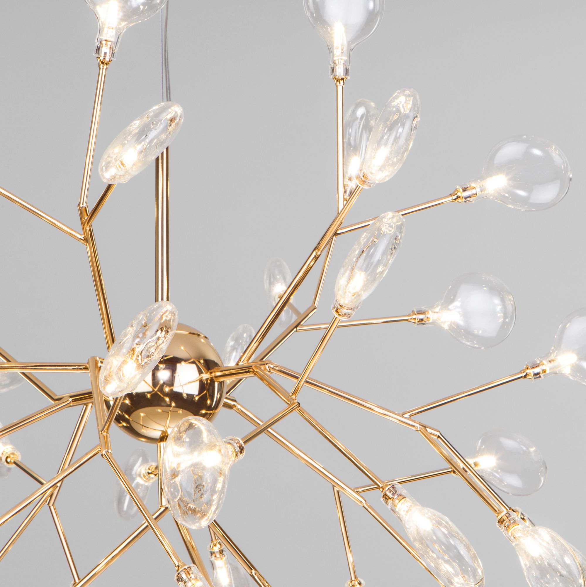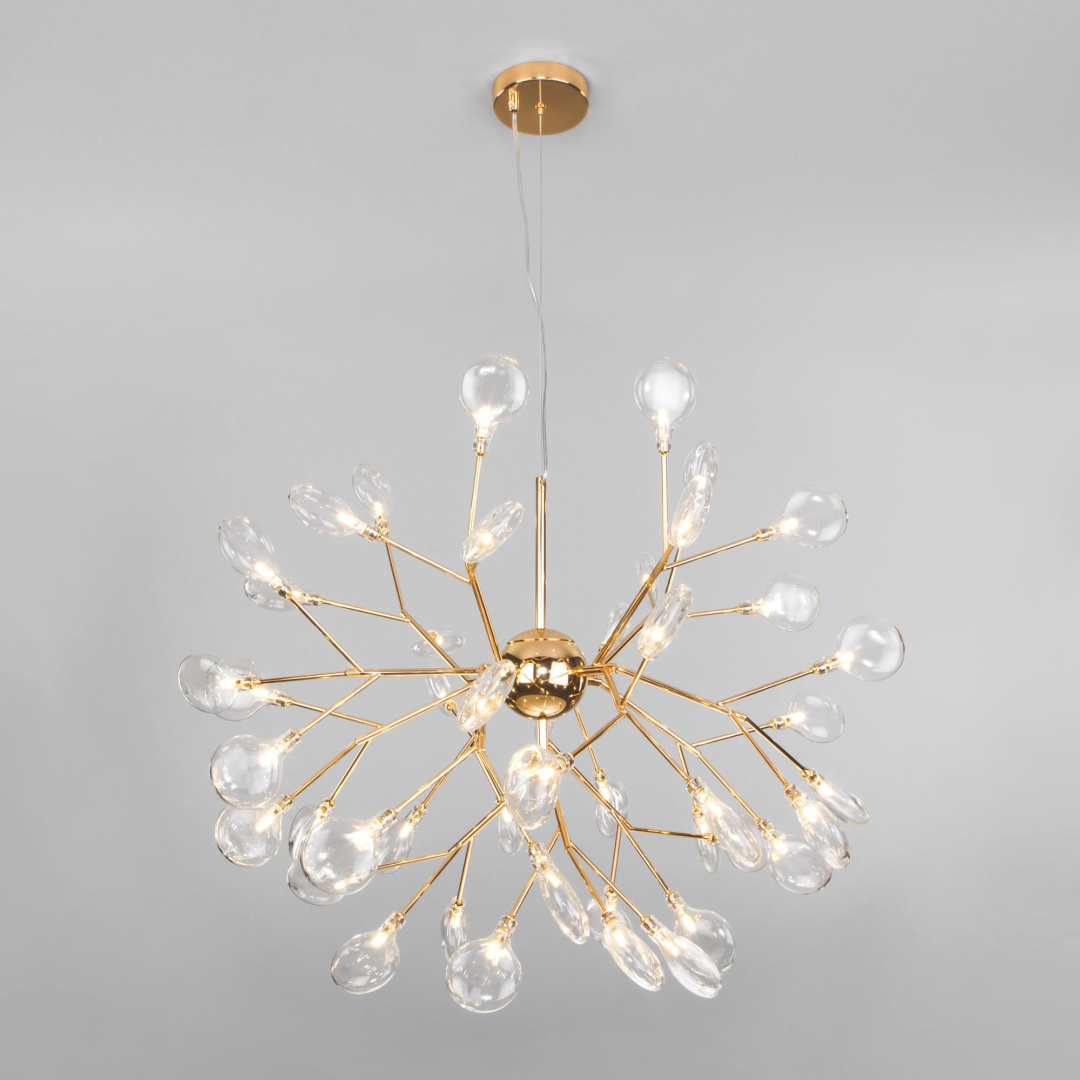 Подвесная люстра на 45 рожков золотая предназначена для создания основного освещения в современных и классических интерьерах, подходит для различных типов помещений: гостиная, спальня и рассчитана на площадь освещения 30 м².