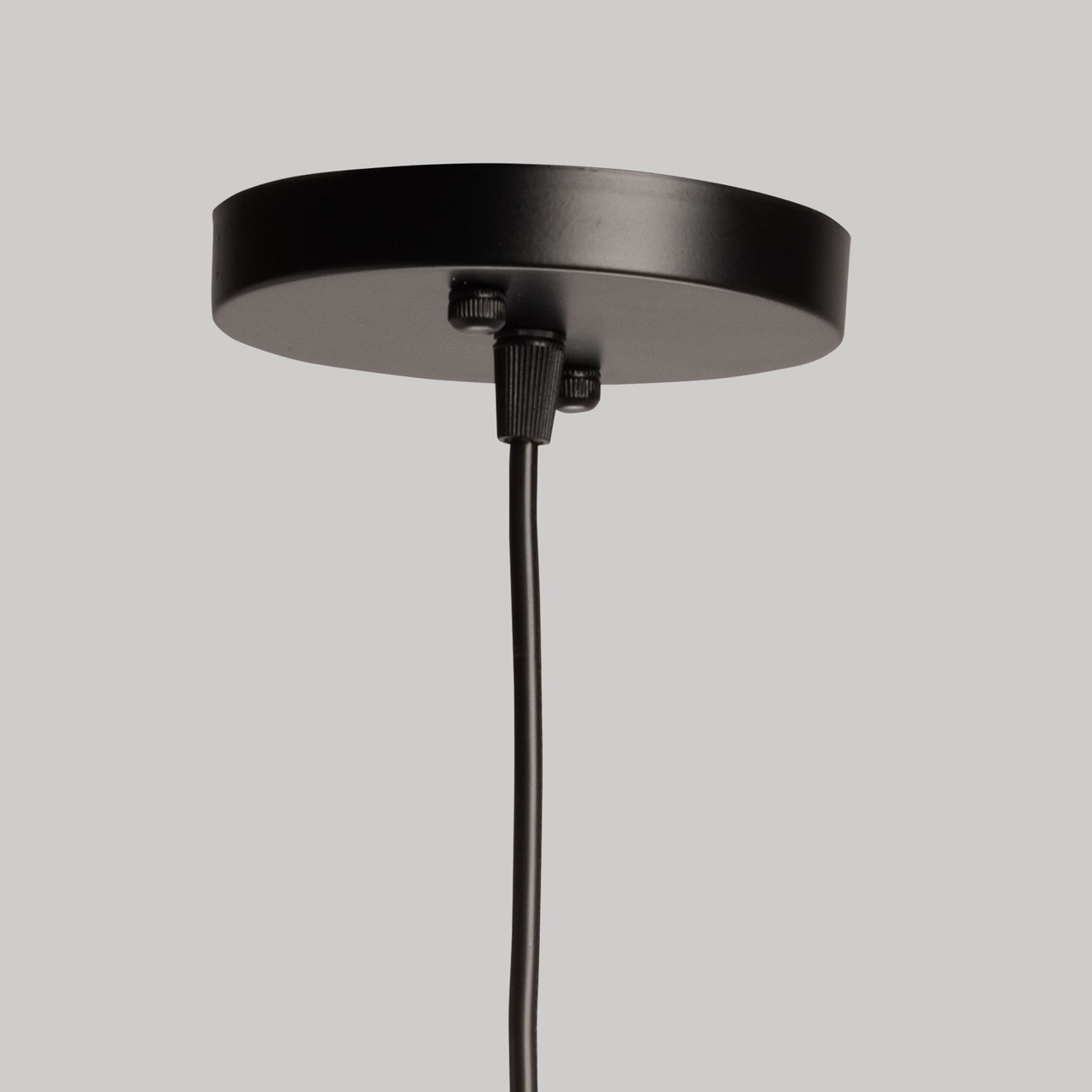 Металлическая потолочная чаша и металлические держатели плафона подвеса окрашены в черный цвет. Стеклянный плафон отлит в сложную форму и гальванизирован в дымчатый цвет. Подвес декорирован многогранным элементом из прозрачного акрила.