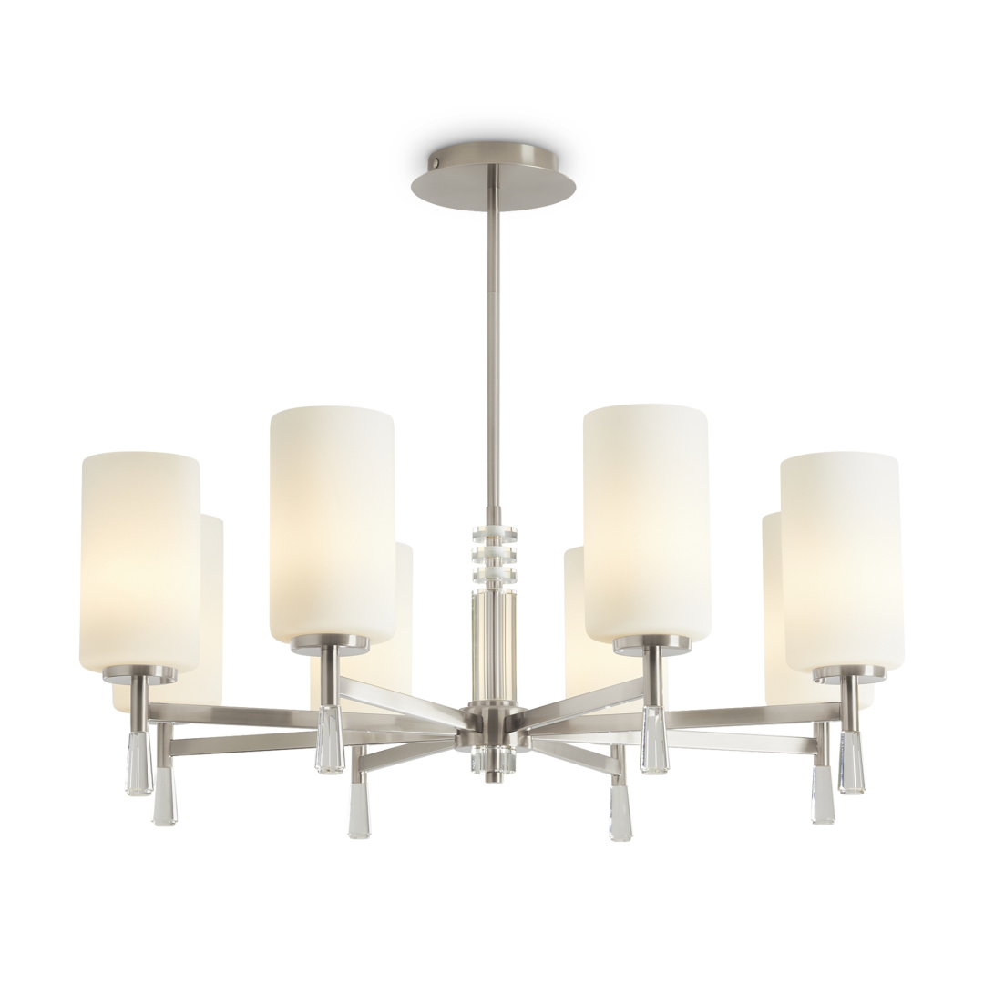 Металлическая арматура: латунь или никель (новинка серии).Белые стеклянные плафоны цилиндрической формы, направленные вверх.. Хрустальное основание с акриловыми каплями. Лампа E27.