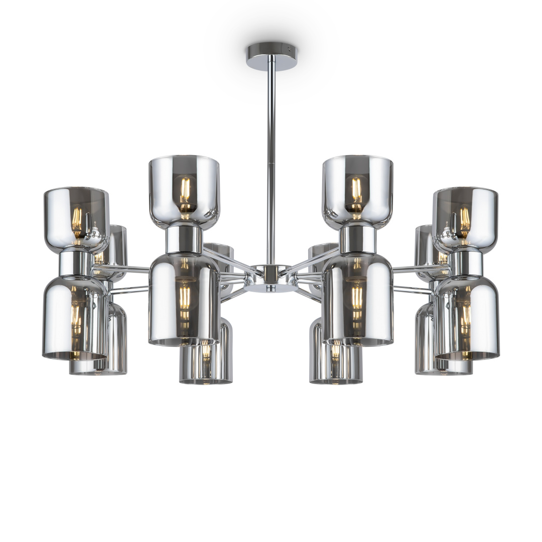 Арматура из металла. Оттенки – хром и латунь. Стеклянные плафоны в двух цветовых решениях: белый глянец и хром с зеркальным эффектом. Оригинальная форма плафонов «песочные часы», двунаправленный световой поток. Широкий ассортимент. Источник света – лампа с цоколем E27.