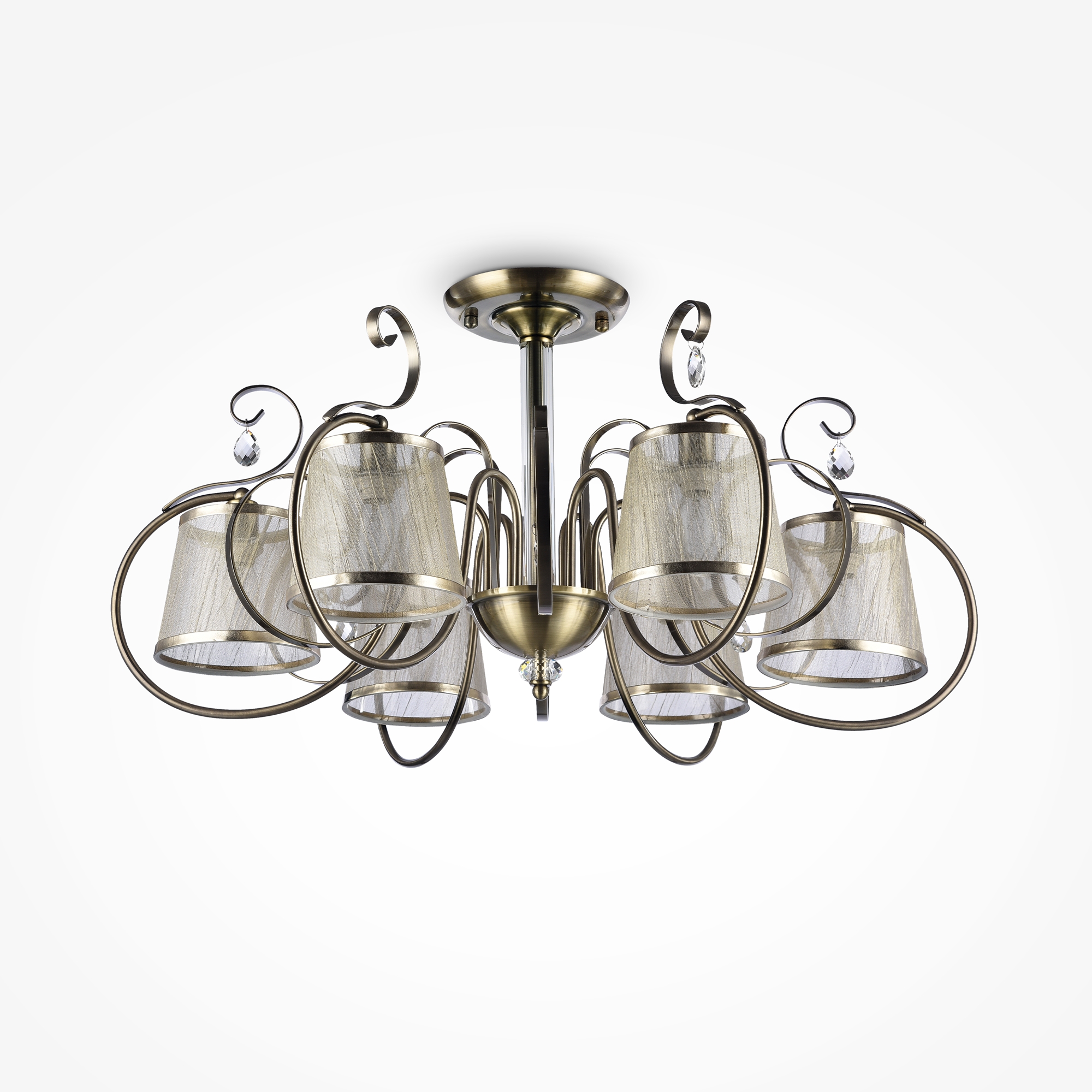 Абажуры и арматура светильников выполнены в разных цветах, с несколькими видами арматуры. Основание люстры украшено стеклянным декоративным элементом, а завитки рожков украшают подвески.