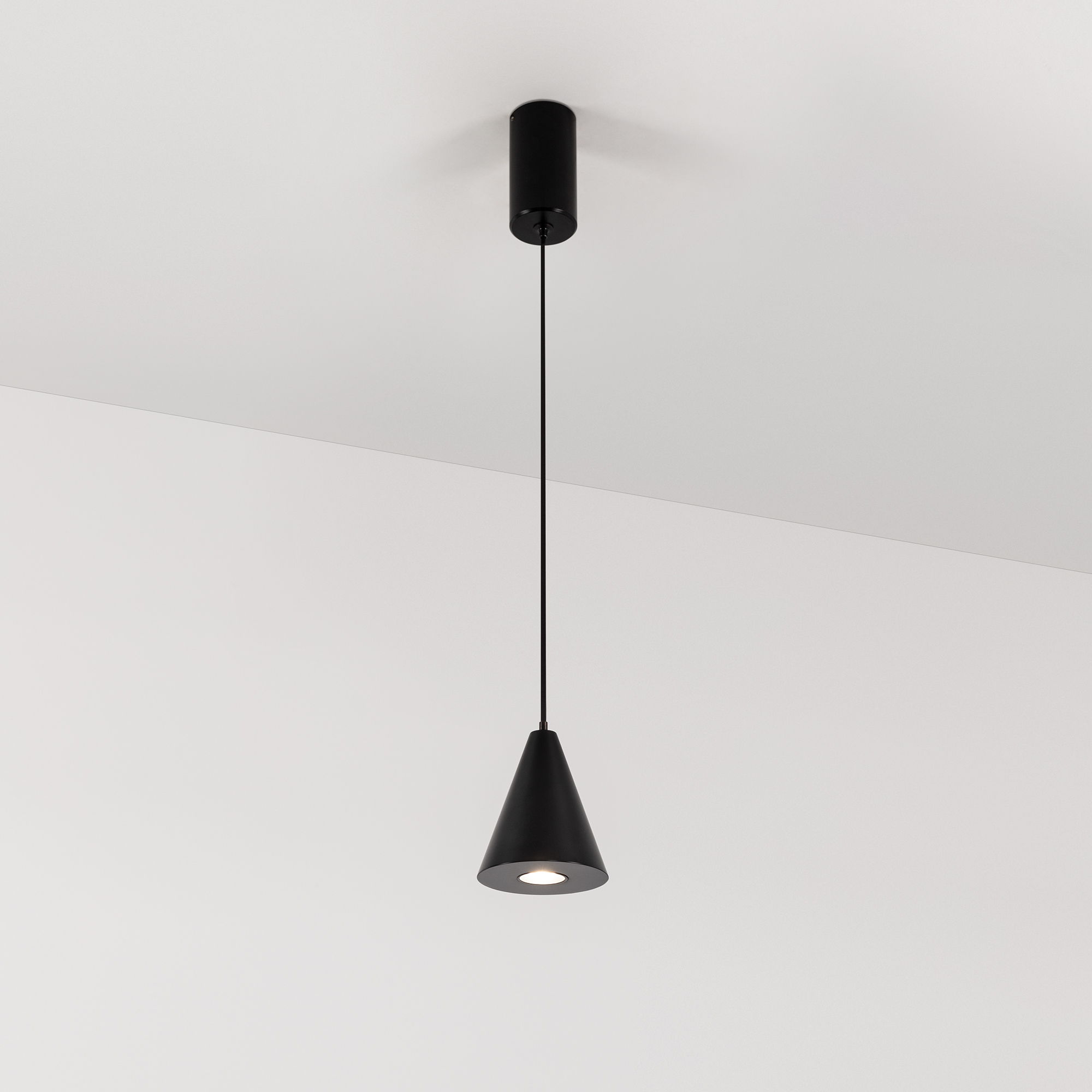 Поставка под заказ от 100 шт. Подвесной светильник. Мощность 9 Вт, св. поток 650 лм, 73 лм/Вт, дневной 4000 K, CRI>80, угол 39°, напряжение питания 230 В. Черный корпус из алюминия, степень защиты IP40. Размер: диаметр 83 мм, высота 97 мм. Монтаж подвесной, длина подвеса 1500мм, регулируемая. Габариты чаши Ø50x95 мм. Драйвер 28-42 В, 250 мА, пульсация <5%.
