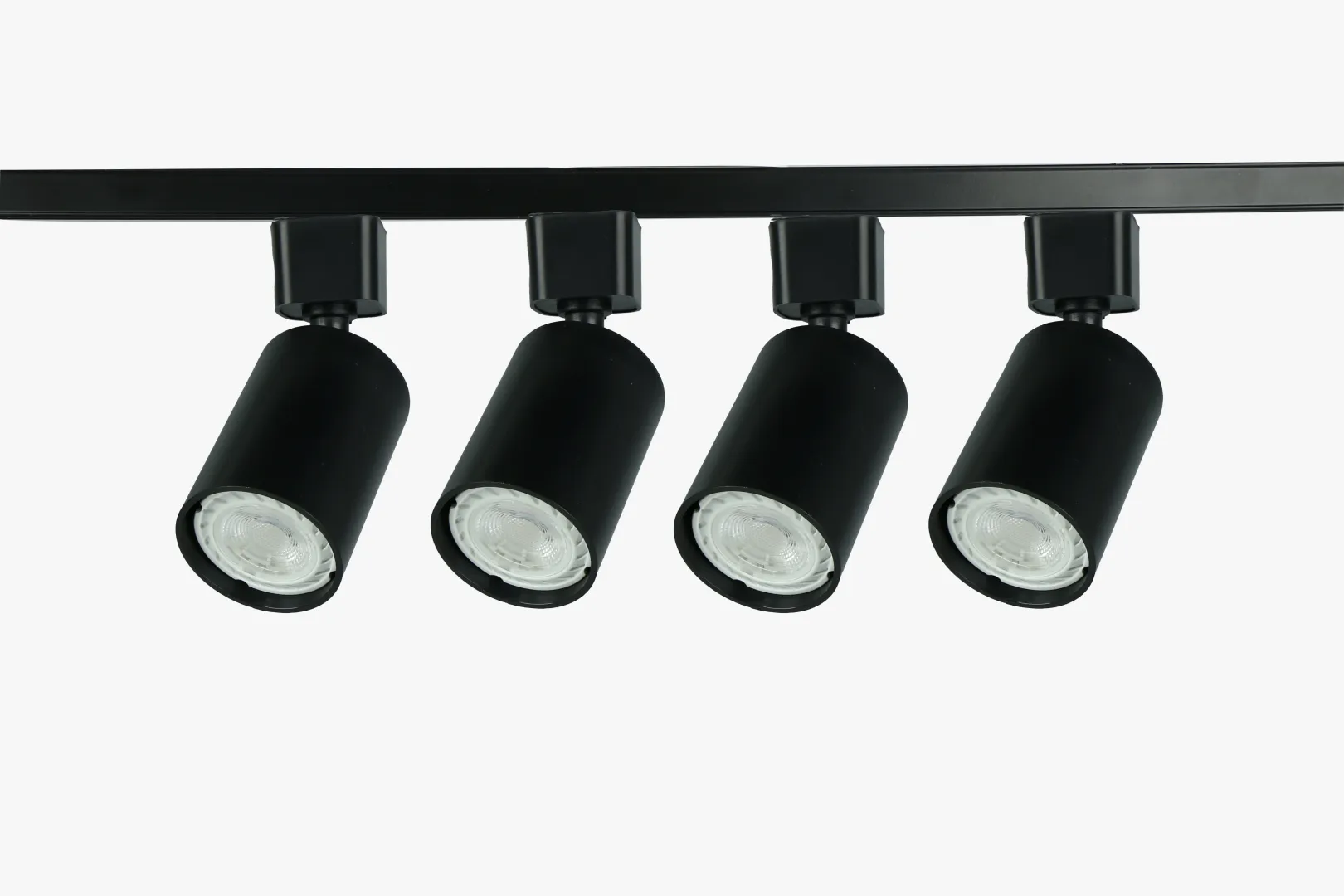 Набор трековых светильников TR70-SET4-GU10, который предназначен для освещения бытовых интерьеров. Комплектация набора: 4 трековых светильника черного цвета с цоколем GU10, однофазный шинопровод 80 см, ввод питания и боковая заглушка.