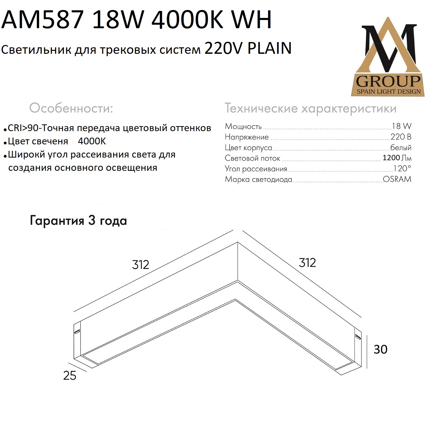 Трековый светильник PLAIN OPAL AM587 18W 4000K WH