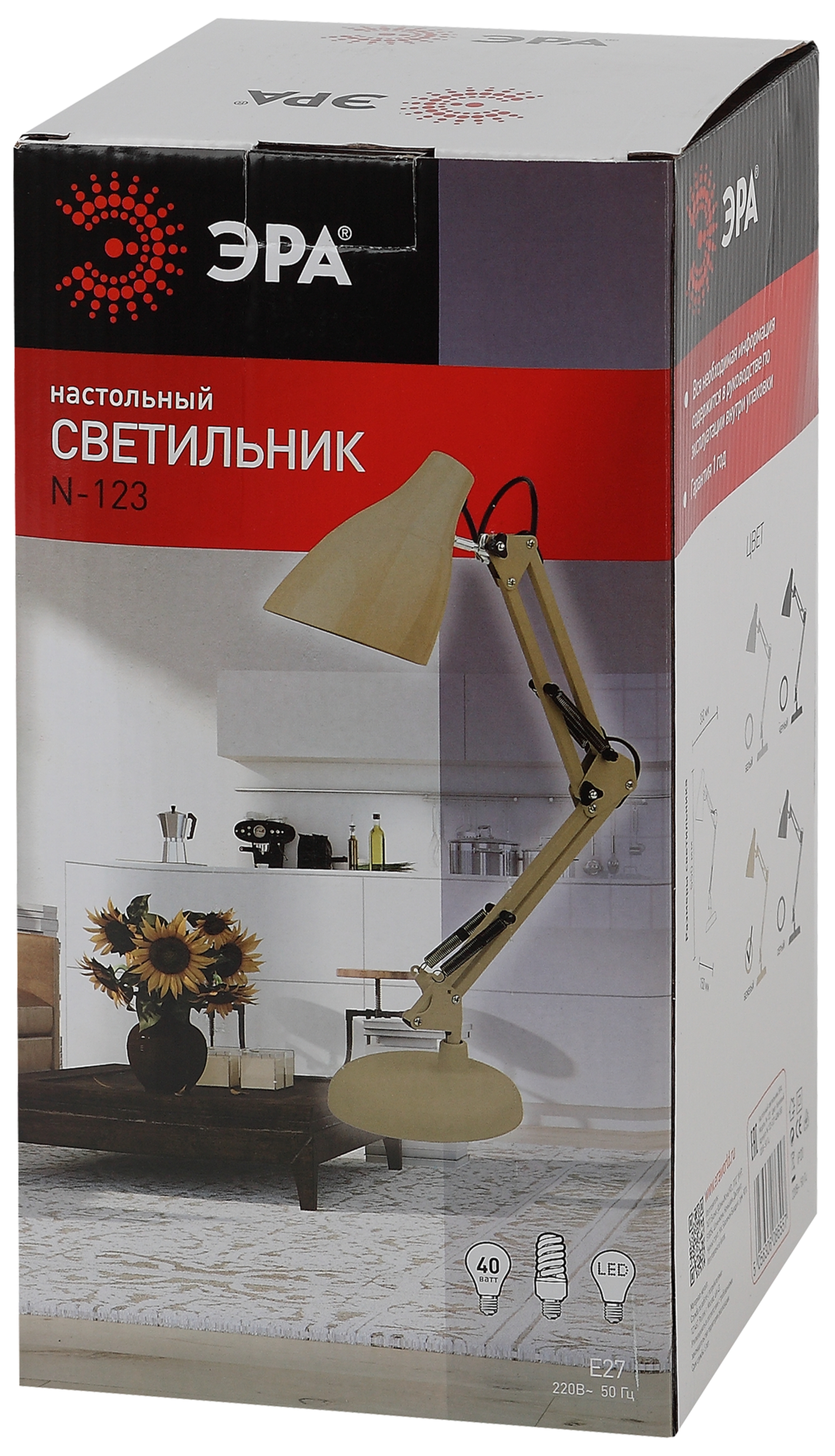 Настольный светильник ЭРА N-123-Е27-40W-BG трендового дизайна с классической конструкцией может использоваться с разными источниками света - лампой накаливания, компактной люминесцентной лампой (КЛЛ) или светодиодной (LED) лампой. Выключатель на проводе. Устойчивое основание. Высота плафона регулируется двухсекционной сгибающейся стойкой, направление света - поворотом и наклоном плафона в любом направлении.