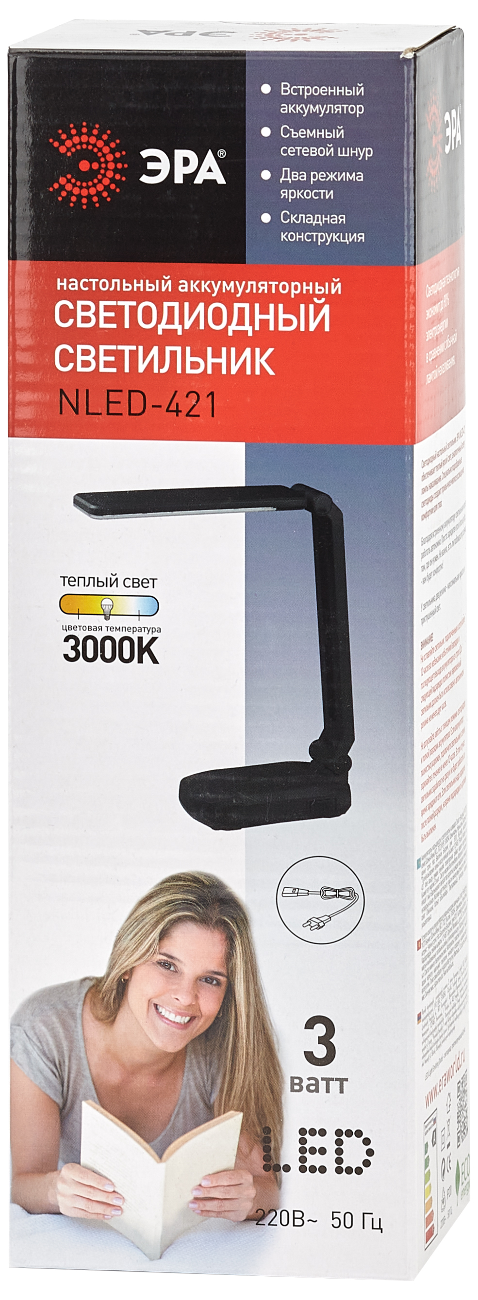 Настольный аккумуляторный светодиодный светильник ЭРА NLED-421-3W-BK обеспечивает теплый яркий свет, аналогичный свету лампы накаливания. Специально подобранные светодиоды создают привычное мягкое освещение. Аккумулятор обеспечивает автономную работу до 4 часов, в зависимости от режима. Можно выбрать максимальная яркость или приглушенный свет. Съемный сетевой шнур в комплекте, устойчивое основание. На основании есть отверстия для подвеса на стену.