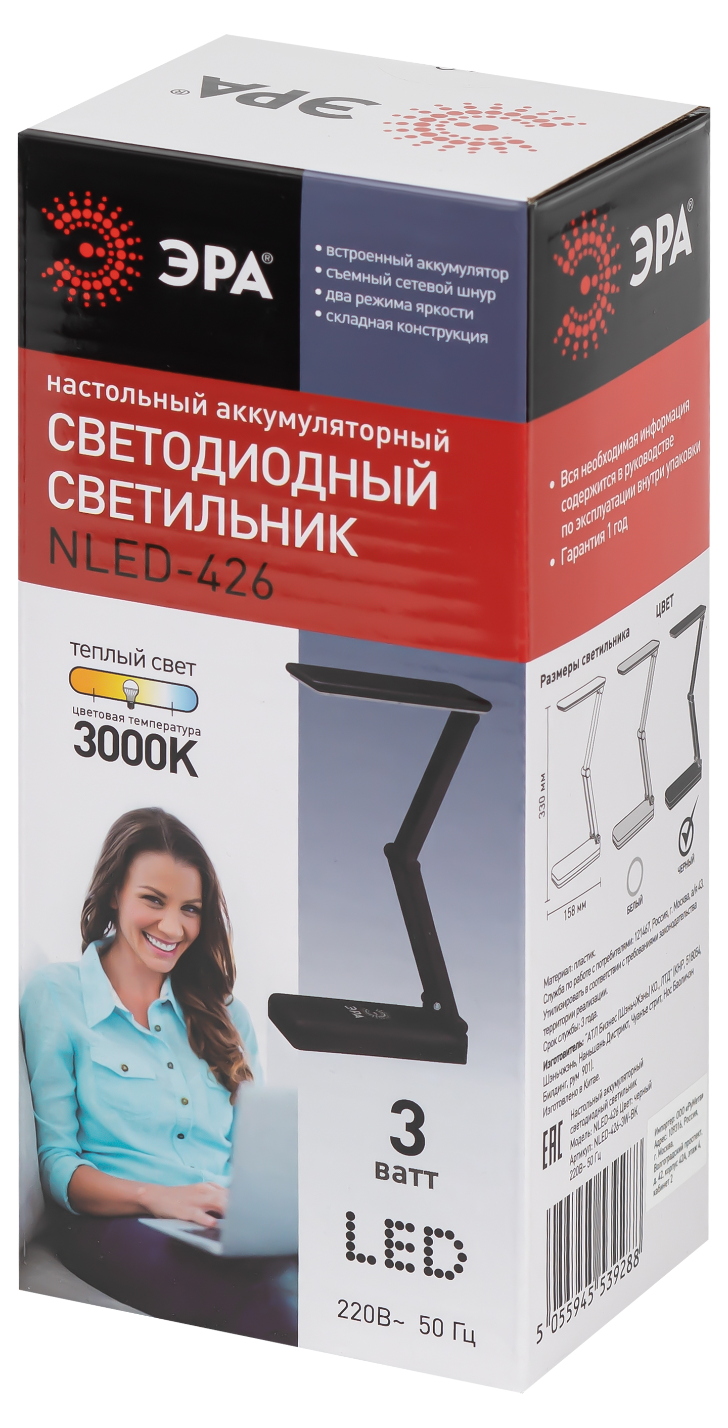 Настольный аккумуляторный светодиодный светильник ЭРА NLED-426-3W-BK может работать автономно. Просто зарядите его и используйте там, где он нужен. Не важно, есть ли поблизости розетка вам будет комфортно! Можно выбрать максимальную яркость или приглушенный свет. Часто этот светильник используют в качестве бытового фонарика. У светильника съемный сетевой шнур в комплекте и складная конструкция для легкости его перевозки и компактного хранения.
