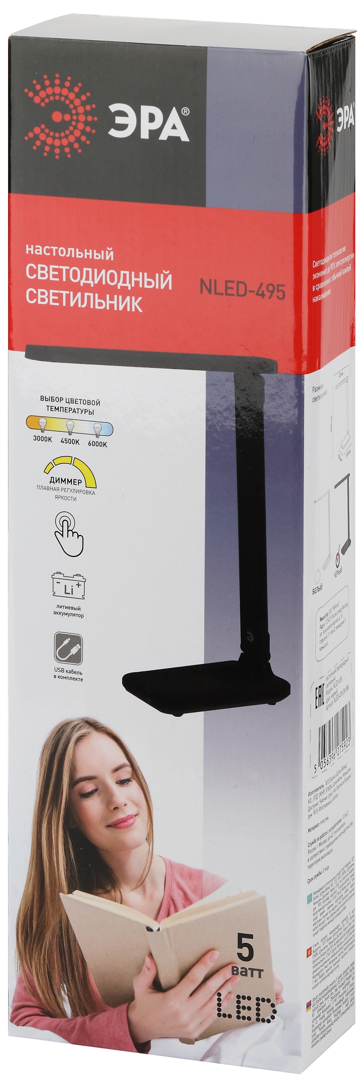 Настольный светильник ЭРА NLED-495-5W-BK со светодиодами (LED) в качестве источников света в дизайне "под кожу". Встроенный литиевый аккумулятор для автономной работы. Подзарядка от USB. USB-кабель в комплекте. Оснащен сенсорным управлением с возможностью выбора цветовой температуры (теплый, нейтральный или холодный свет). Плавный диммер для регулировки яркости. Выключатель для отключения/блокировки сенсора. Направление света регулируется наклоном стойки и поворотом панели со светодиодами относительно стойки для максимального комфорта. Складная конструкция для оптимального хранения.