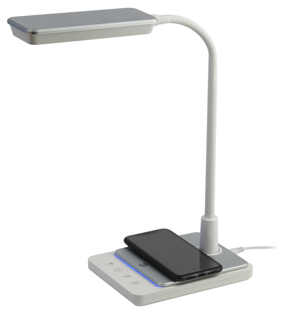 Настольный светильник ЭРА NLED-499-10W-W со светодиодами (LED) в качестве источников света. Оснащен сенсорным управлением с возможностью выбора цветовой температуры (теплый, нейтральный или холодный свет). Плавный диммер для регулировки яркости. Светильник сохраняет выбранные настройки при включении-выключении. Направление света регулируется наклоном и поворотом плафона в любом направлении. Светильник имеет встроенный модуль Qi для беспроводной зарядки мобильных устройств. Просто положите телефон, поддерживающий функцию Qi, на основание светильника в отмеченной зоне - светильник подзарядит его удобно и быстро!
