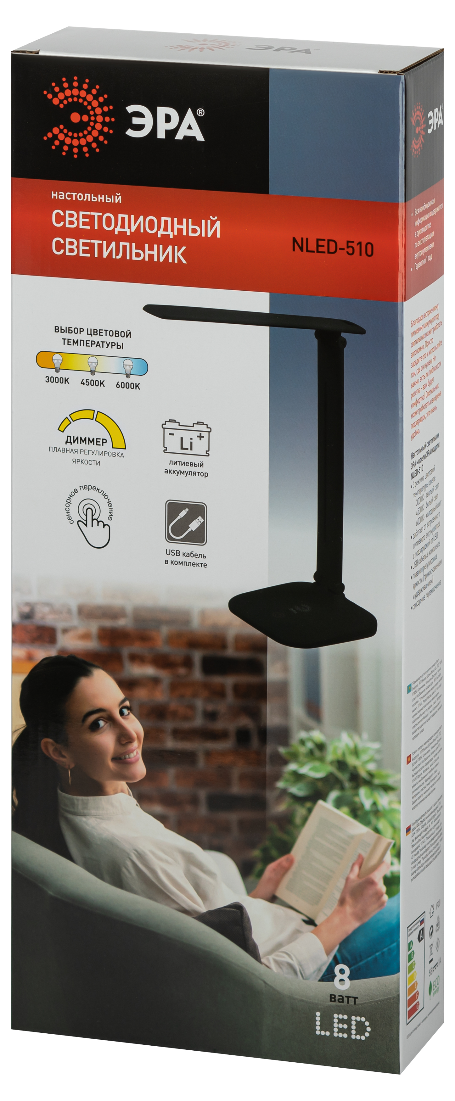 Настольный светильник ЭРА NLED-510-8W-BK со светодиодами (LED) в качестве источников света. Встроенный литиевый аккумулятор для автономной работы. Подзарядка от USB. USB-кабель в комплекте. Оснащен сенсорным управлением с возможностью выбора цветовой температуры (теплый, нейтральный или холодный свет). Плавный диммер для регулировки яркости. Складная конструкция для оптимального хранения.