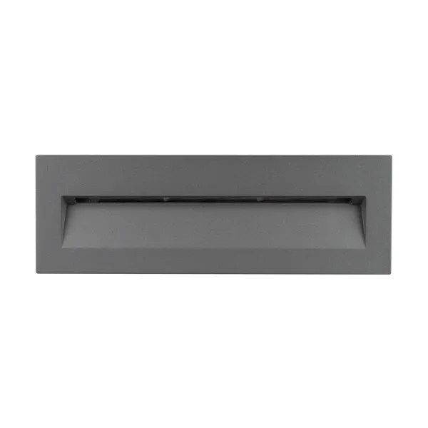 Светодиодный встраиваемый прямоугольный светильник для стен, лестниц, 8Вт. Цвет ТЕПЛЫЙ БЕЛЫЙ 3000K, св.поток 330лм, CRI(Ra)>80, угол 65°, асимметричный свет. Размер 226x76x54мм (закладная часть 214x69x70мм). Влагозащищенный корпус IP65, алюминий серого цвета. Питание AC230V, 8Вт, встроенный драйвер.