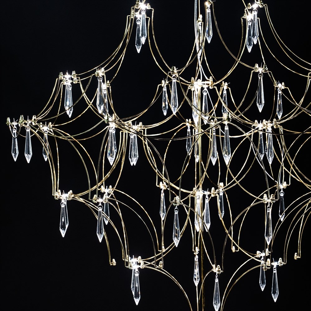 Роскошная люстра Christina – стильное украшение интерьера. Многоярусная конструкция, декорированная подвесками или стекла или хрусталя, смотрится очень нарядно. По форме модель повторяет классические люстры, а современный вид ей придает каркас из тонких изогнутых стальных прутков, плавно перетекающих друг в друга. Расположенные по внешнему периметру подвески подсвечиваются яркими светодиодами. Отражаясь в гранях стекла, лучи расходятся вокруг, создавая блики на стенах и мебели. Дизайнерский подвесной светильник – ручная работа.