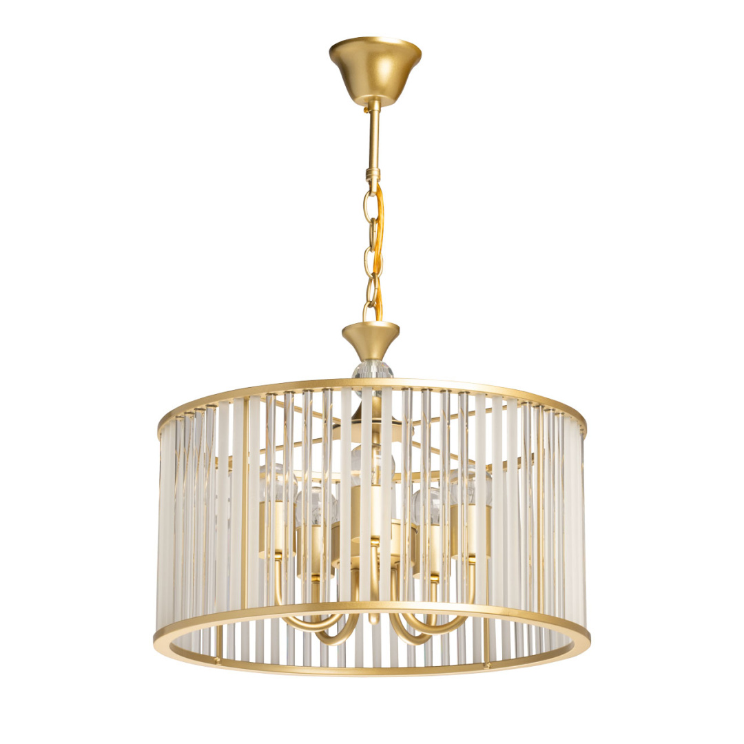 Металлическое основание подвесной люстры окрашено в цвет перламутрового золота. Плафон декорирован стеклянными трубочками прозрачными и матовыми. Центральная ось люстры декорирована массивом из прозрачного  хзрусталя.