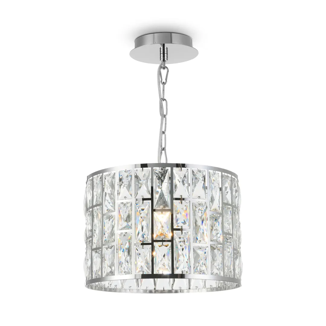 Металлическая арматура, цвет – хром. Каркас абажура – металл, декор – прозрач ный хрусталь. Потолочные модели с рассеивателем из матового стекла. Высота подвесных светильников регулируется.